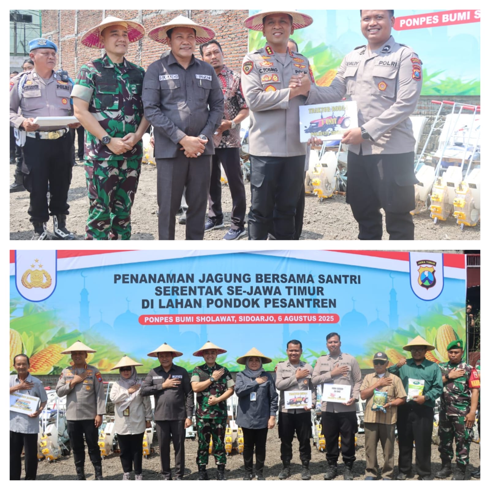 Forkopimda Sidoarjo melakukan penanamam jagung serentak di lahan Pondok Pesantren Bumi Sholawat, Rabu (6/8/2025). Kegiatan dari upaya mendukung program ketahanan pangan nasional sesuai Asta Cita Presiden Prabowo Subianto ini diadakan Polri dengan menggandeng Pesantren di Jawa Timur.