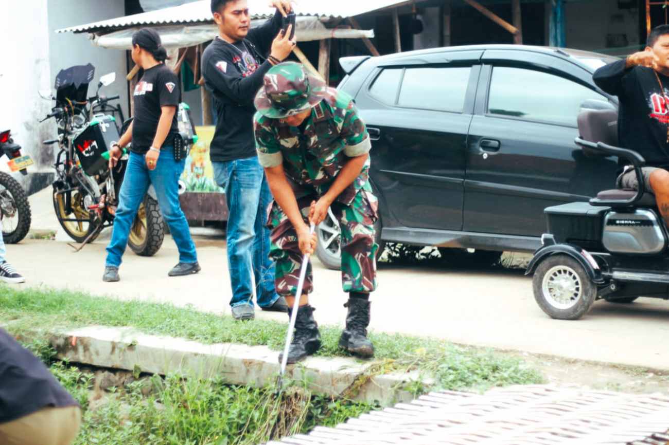 Kapten Inf Sugianto menunjukkan teladan luar biasa dengan tidak segan-segan memungut sampah yang mengotori aliran sungai.