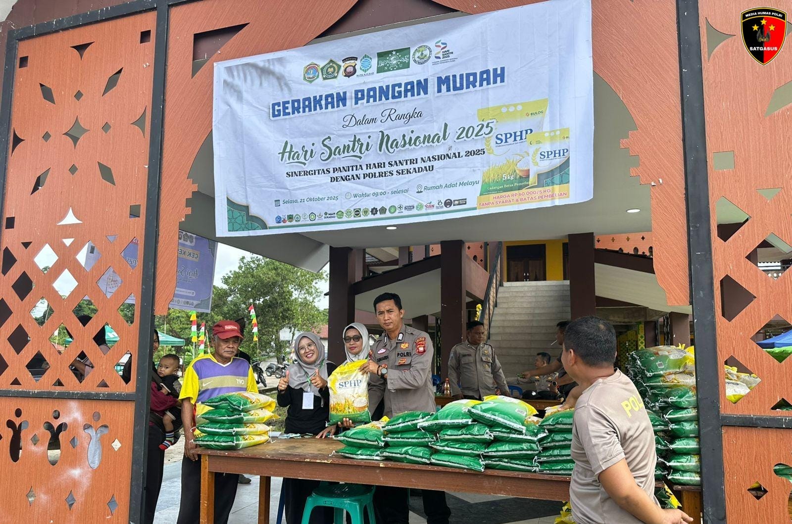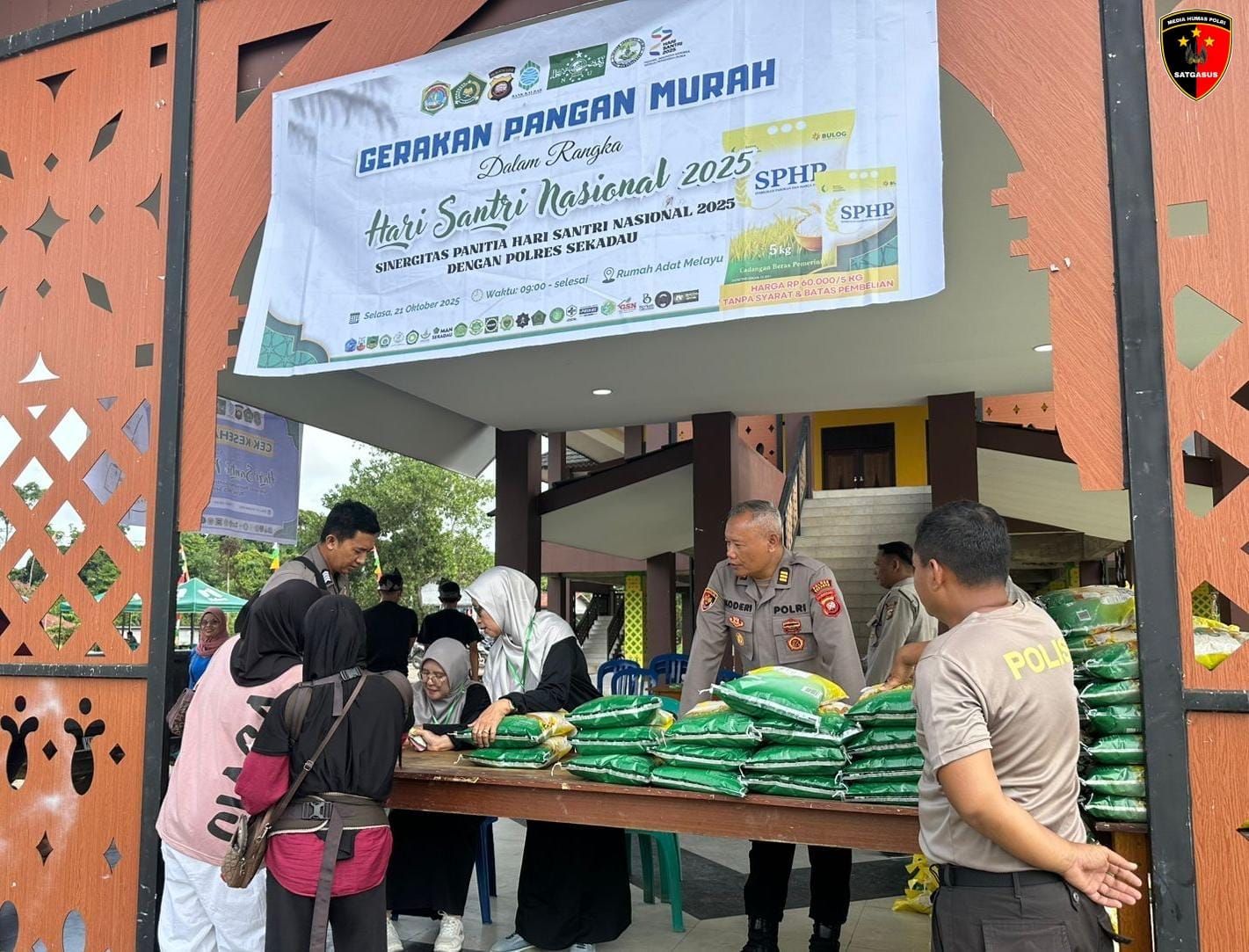 Di sela pelaksanaan pengamanan peringatan Hari Santri Nasional 2025, Polres Sekadau turut menggelar Gerakan Pangan Murah (GPM) berupa penjualan beras SPHP kepada masyarakat di area Rumah Adat Melayu Sekadau, Jalan Merdeka Barat, Selasa (21/10/2025).