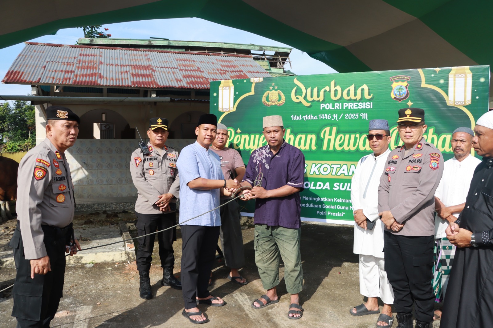 Kapolres Kotamobagu AKBP Irwanto, SIK, MH menyerahkan secara simbolis sapi kurban ini kepada panitia Masjid Al-Mustaqim Polres Kotamobagu setelah pelaksanaan Sholat Ied, Jumat (6/6/2025).