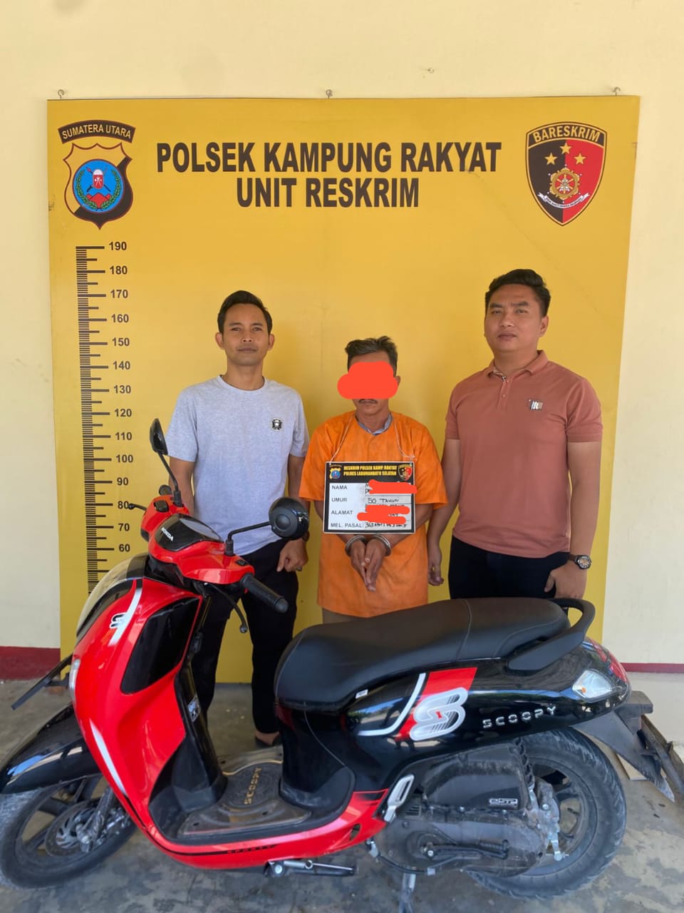 Tersangka ditangkap di Desa Pematang Seleng, Kecamatan Bilah Hulu, Kabupaten Labuhanbatu. Dari hasil interogasi, pelaku mengakui perbuatannya. Polisi juga mengamankan barang bukti berupa satu unit sepeda motor Honda Scoopy, kunci kontak, dan STNK.