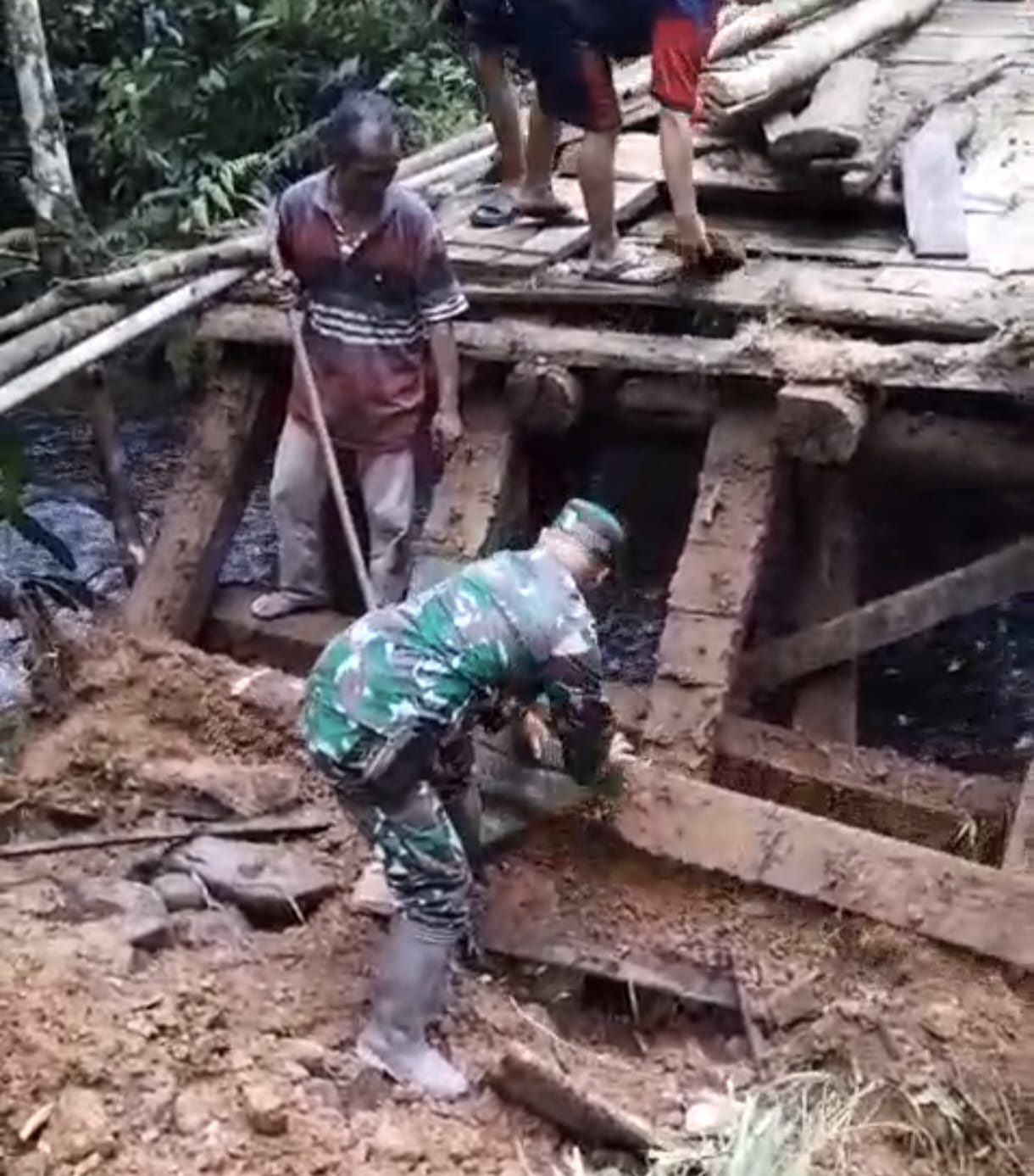 Babinsa Koramil 1002-07/Batu Benawa, Sertu Sanu, bersama warga Desa Patikalain RT 05 melaksanakan gotong royong perbaikan jembatan yang rusak akibat longsor, Minggu (28/9).