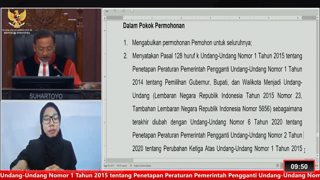 Mahkamah Konstitusi Republik Indonesia mengabulkan seluruhnya permohonan Perkara Nomor 91/PUU-XXIII/2025 yang menguji norma Pasal 128 huruf k Undang-Undang Nomor 10 Tahun 2016 tentang Pemilihan Gubernur, Bupati, dan Walikota Menjadi Undang-Undang (UU Pilkada). Mahkamah Konstitusi mengabulkan permohonan yang diajukan oleh Dewan Pimpinan Daerah Lembaga Pengawasan Reformasi Indonesia (DPD-LPRI) Kalimantan Selatan yang diketuai oleh Syarifah Hayana Binti Said Muhammad Alaydrus tersebut secara cepat tanpa mendengar keterangan DPR dan Pemerintah dalam agenda pemeriksaan persidangan.