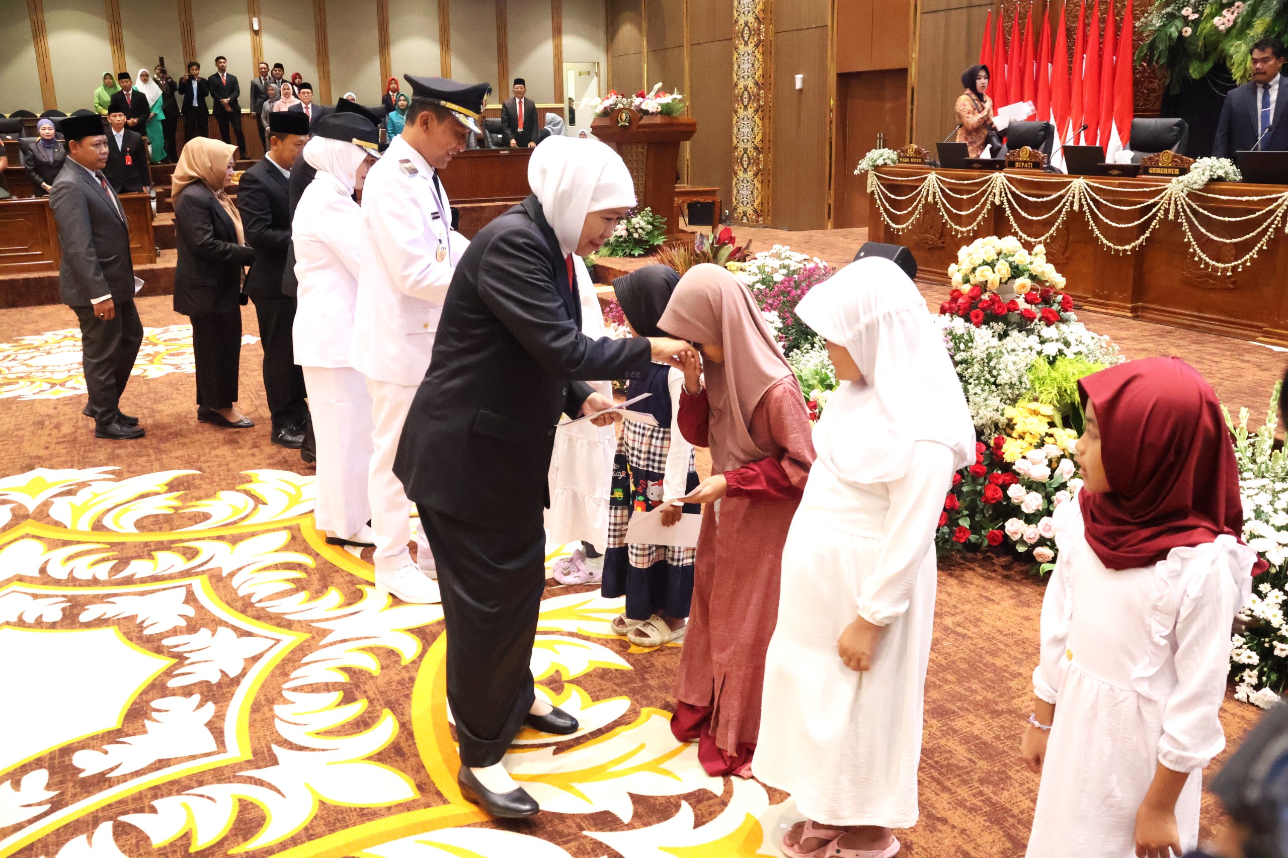 Gubernur Jawa Timur, Khofifah Indar Parawansa menghadiri acara Serah Terima Jabatan Bupati dan Wakil Bupati Bojonegoro dan Rapat Paripurna Istimewa Sambutan Bupati Bojonegoro Masa Jabatan Tahun 2020-2030, di ruang Rapat Paripurna Gedung DPRD Bojonegoro, Selasa (4/3/2025).