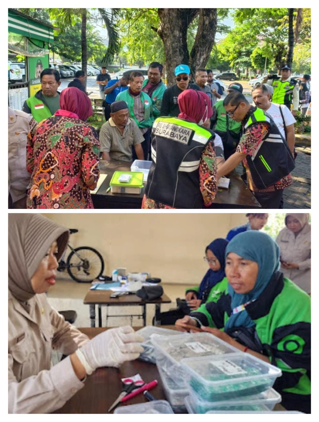 Sedikitnya ada 295 driver Ojek Online (Gojek & Grab) mendatangi lokasi tersebut untuk menerima layanan kesehatan gratis dari Biddokkes Polda Jatim.
