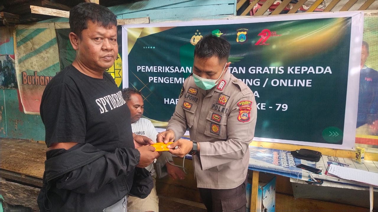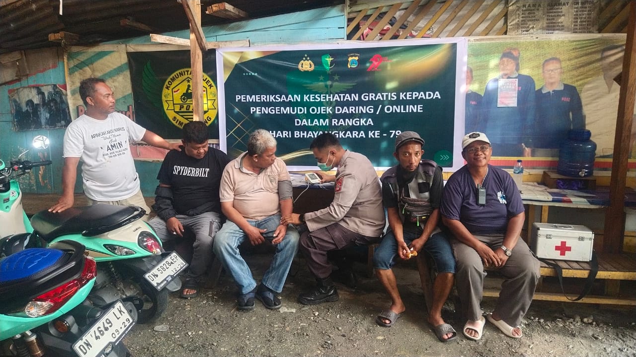 Dalam rangka menyambut Hari Ulang Tahun Bhayangkara ke-79, Polres Poso melalui Seksi Kedokteran dan Kesehatan (Sie Dokkes) menggelar kegiatan pemeriksaan kesehatan dan pemberian obat/vitamin kepada para pengemudi ojek online/daring. Jumat, 13 Juni 2025, mulai pukul 09.00 Wita di pangkalan ojek Simatupang, Kabupaten Poso.