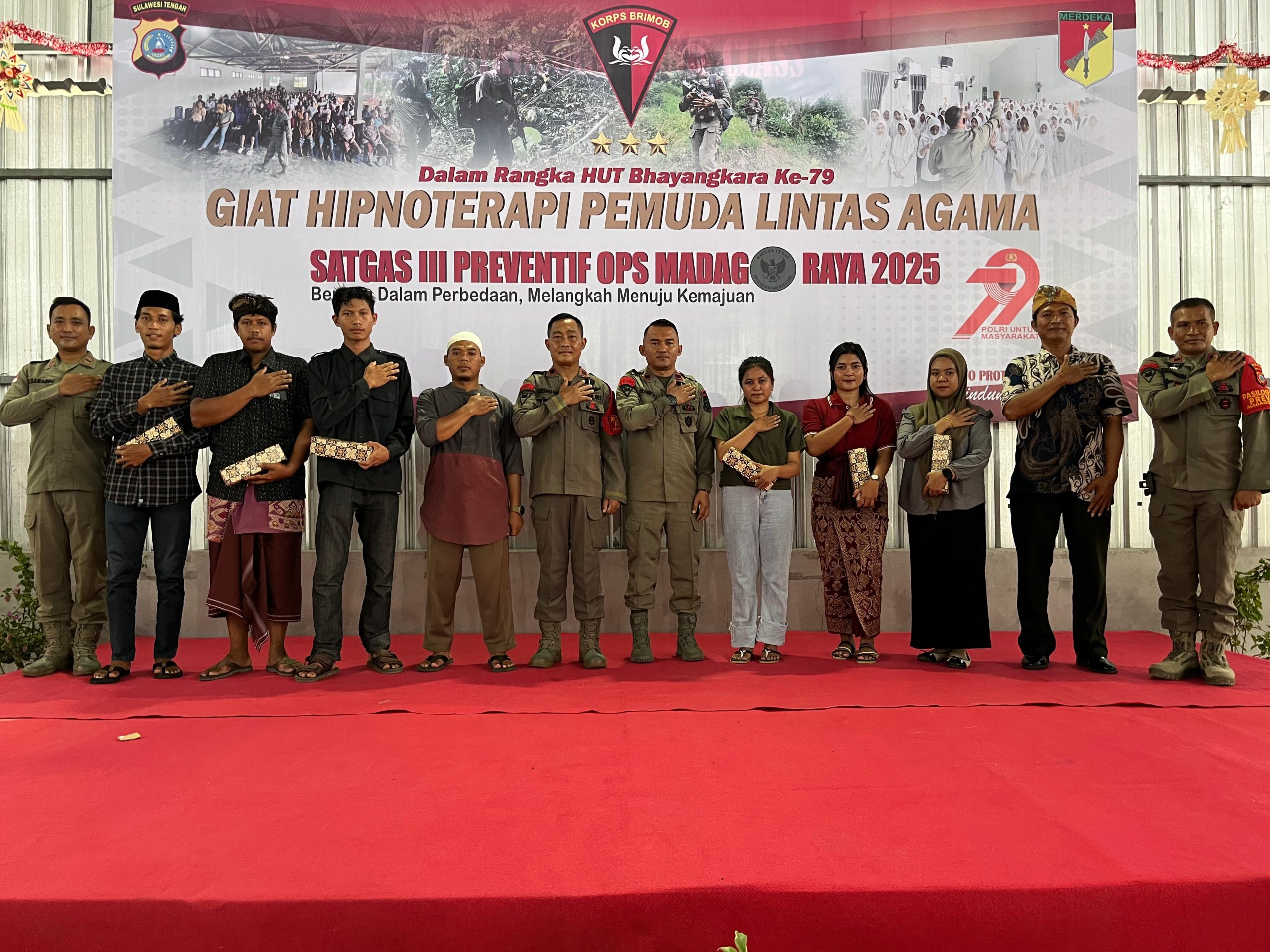 Dalam rangka memperingati Hari Bhayangkara ke-79, Satgas III Preventif Operasi Madago Raya menggelar kegiatan hipnoterapi lintas agama di Hanggar Poskotis Tokorondo, Kecamatan Poso Pesisir, Kabupaten Poso, Rabu (25/6/2025). Sebanyak 250 pemuda dari tiga agama berbeda ikut ambil bagian dalam kegiatan tersebut.
