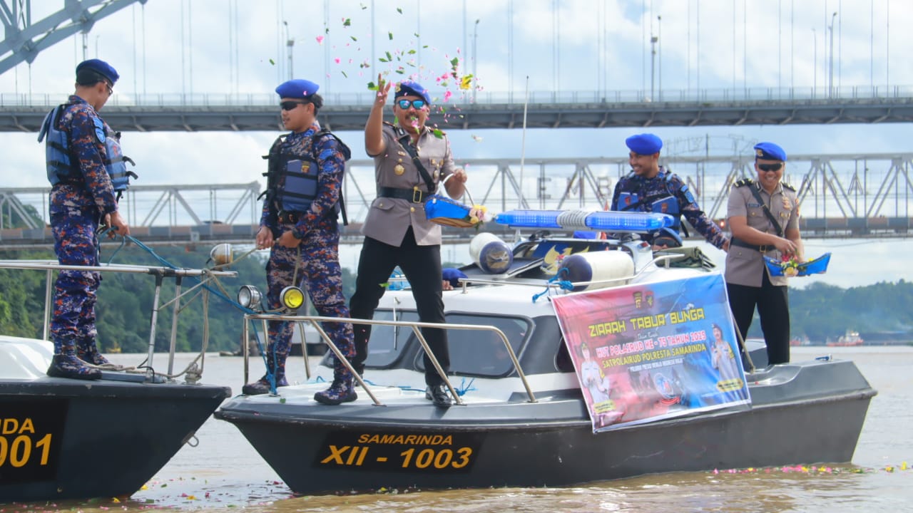 Satpolairud Polresta Samarinda menggelar upacara tabur bunga di perairan Sungai Mahakam sebagai rangkaian puncak peringatan Hari Ulang Tahun (HUT) Polairud Ke-75 Tahun pada Selasa, (25/11) siang.