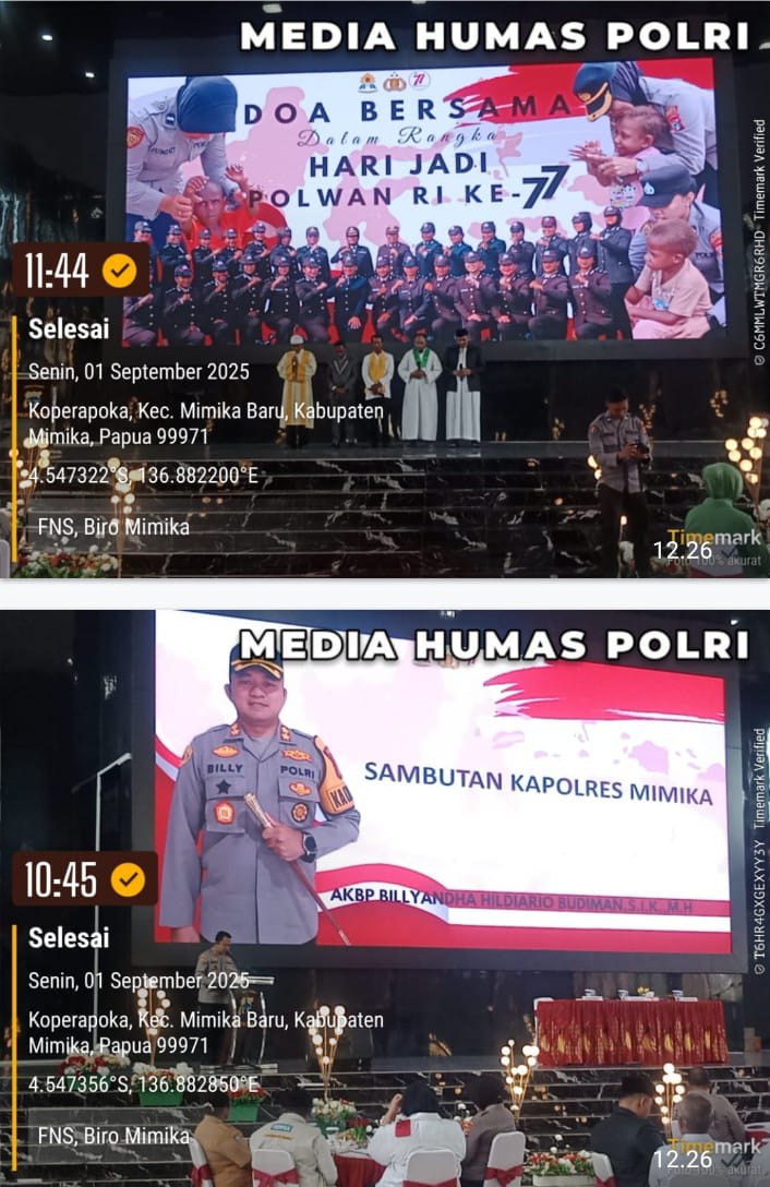 Kepolisian Resor Mimika menggelar doa lintas agama sekaligus memperingati HUT Polwan ke-77 yang dilaksanakan di Gedung Eme Neme Yauware pada Senin (1/9/2025).