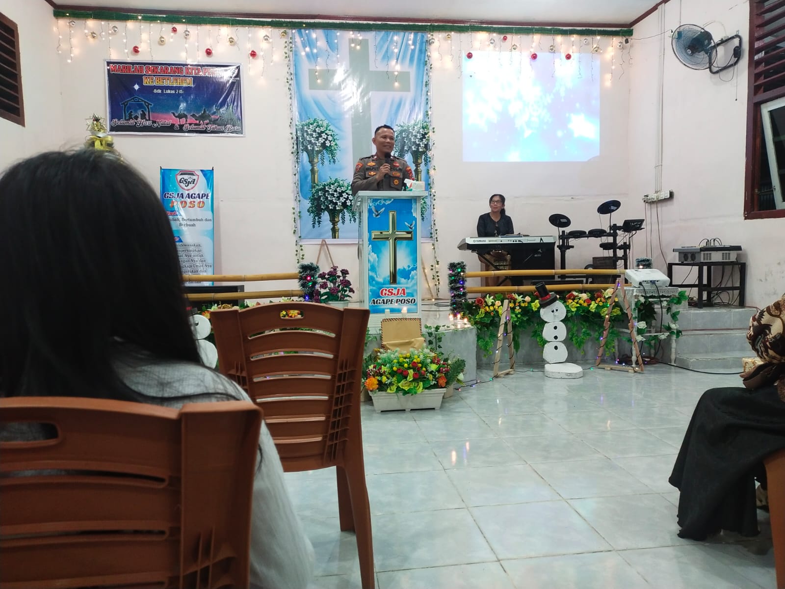 Dalam suasana penuh hikmat, Aiptu Halput Tarusu, S.Th, yang juga merupakan Rohaniawan Kamtibmas, menghadiri dan mengikuti ibadah Natal yang berlangsung di Gereja Sidang Jemaat Allah (GSJA) Agape, Kelurahan Kasintuwu, Kecamatan Poso Kota Utara, Kabupaten Poso, pada Jumat (13/12/2024).