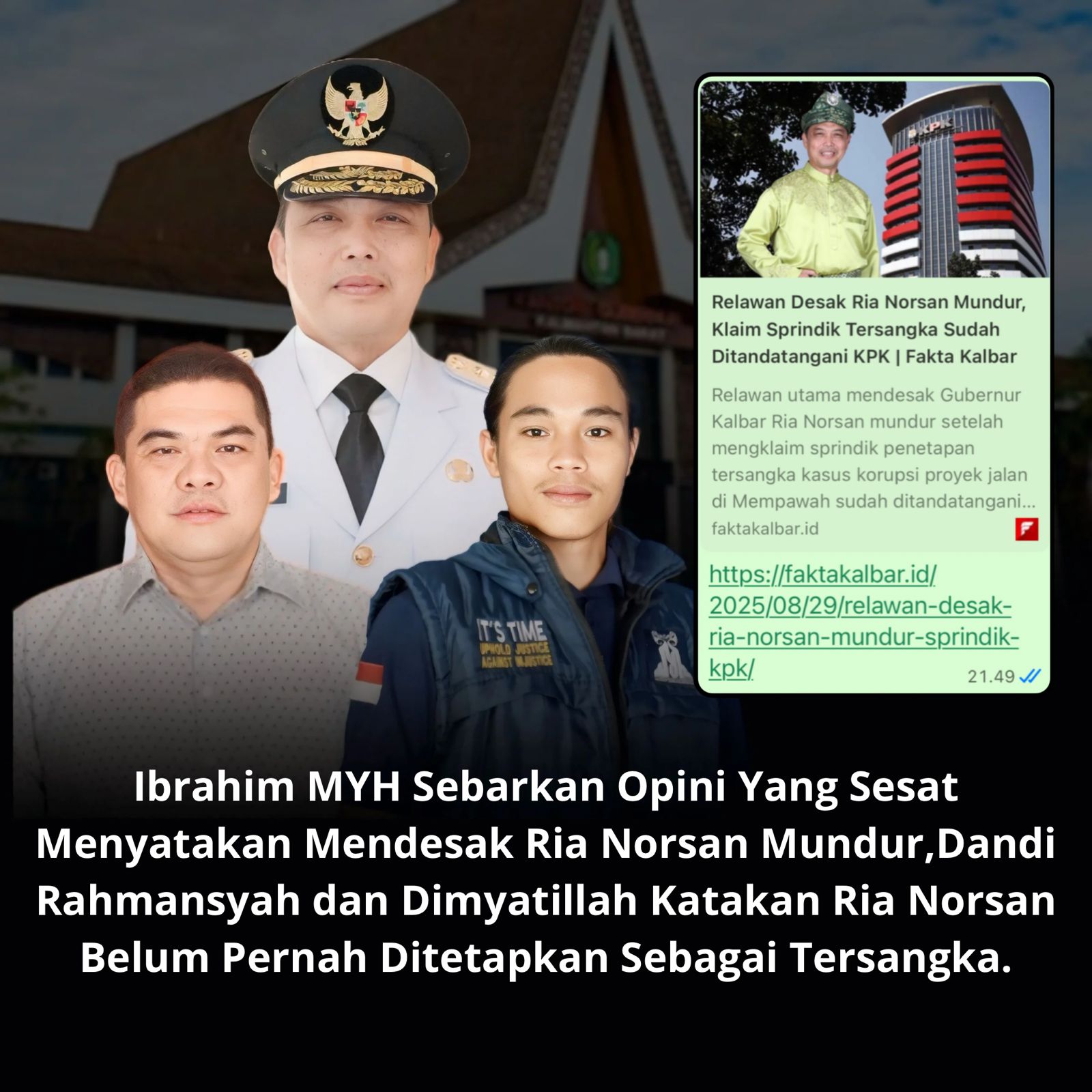 Terkait pemberitaan online Faktakalbar.Id pada Jumat 29 Agustus 2025 dengan judul Relawan Desak Ria Norsan Mundur, Klaim Sprindik Tersangka Sudah Ditandatangani KPK, Dandi Rahmansyah selaku ketua Team Relawan Pemenangan Ria Norsan dan Dimyatillah selaku Mantan Ketua KNPI Kalbar merespon pemberitaan tersebut.