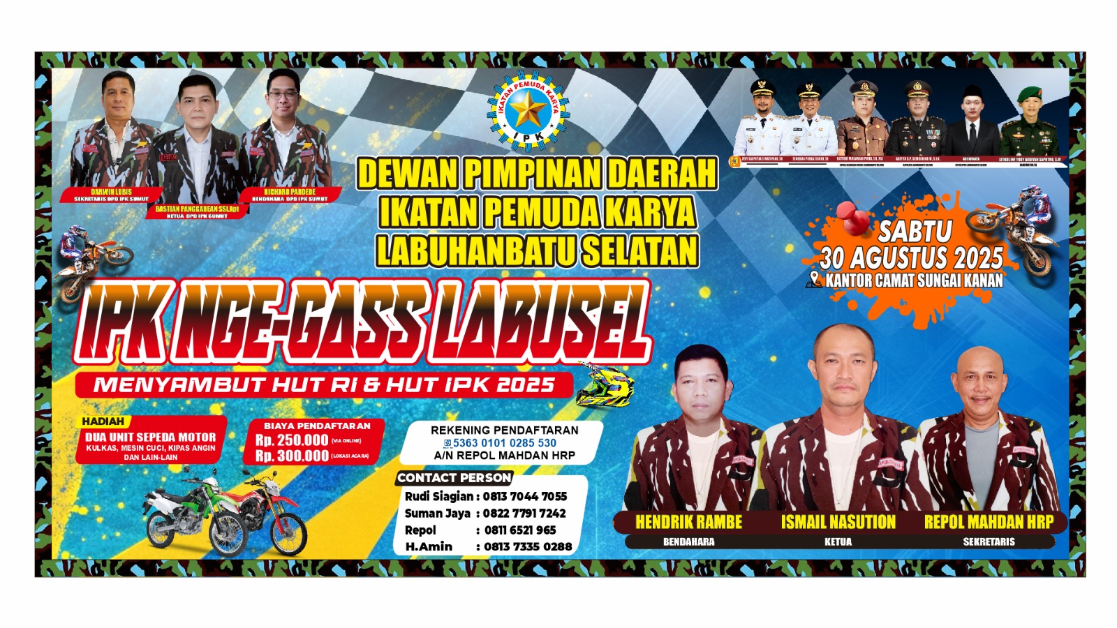 Dalam rangka memeriahkan Hari Ulang Tahun Kemerdekaan Republik Indonesia ke-80 dan Hari Ulang Tahun Ikatan Pemuda Karya (IPK) tahun 2025, Dewan Pimpinan Cabang Ikatan Pemuda Karya (DPD IPK) Kabupaten Labuhanbatu Selatan akan menggelar acara bertajuk “IPK Nge-Gass Labusel”. Kegiatan ini dijadwalkan berlangsung pada Sabtu, 30 Agustus 2025, yang akan dimulai dari Kantor Camat Sungai Kanan.