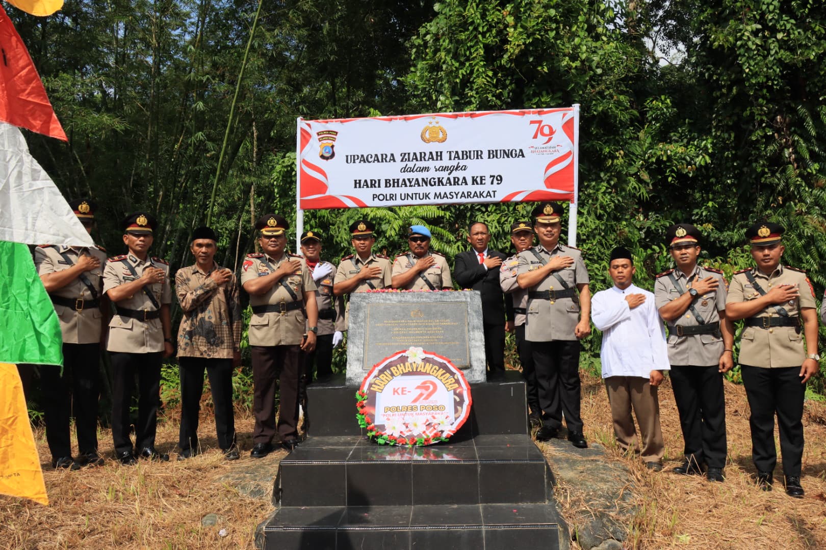 Upacara Tabur Bunga di Tugu Andi Sapa Sudirman merupakan salah satu rangkaian kegiatan yang dilaksanakan oleh Polres Poso dalam rangka memperingati Hari Bhayangkara ke-79. ( Eferdi)
