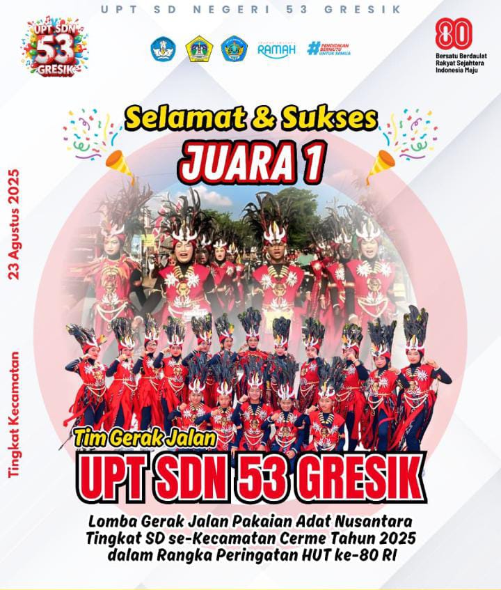 Juara 1 Lomba Gerak Jalan Pakaian Adat Nusantara Tingkat SD se-Kecamatan UPT SDN 53 Kabupaten Gresik