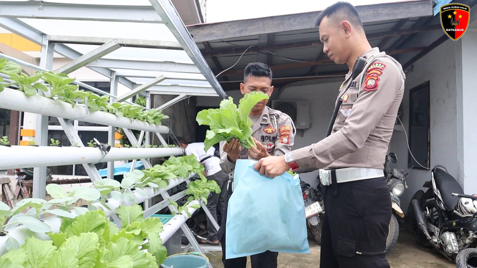 Personel Satlantas membawa bantuan berupa beras, telur, mi instan, dan sayur sawi hasil panen kebun hidroponik yang ditanam di depan Pos Lantas. Kebun ini merupakan bagian dari program Pekarangan Pangan Lestari (P2L) yang dikelola Satlantas dalam mendukung program ketahanan pangan.