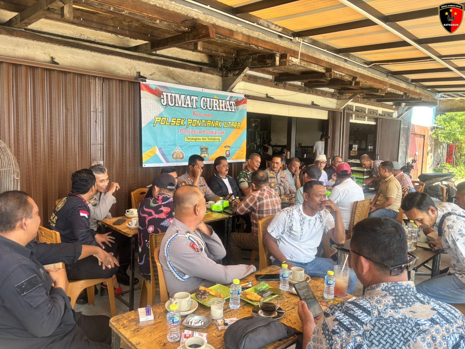 Dalam menjaga situasi kamtibmas yang aman dan kondusif Kapolsek Pontianak Utara ajak masyarakat turut berperan unjuk mewujudkannya hal ini disampaikan dalam kegiatan ngopi bersama masyarakat yang bertajuk Jum”at Curhat yang berlangsung di Warkop Kopitiam Jl. Gst. Situt Mahmud pontianak Utara. Jum’at (11/7/2025).