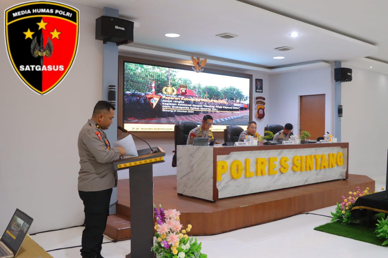 Wakapolda Kalbar Brigjen Pol Roma Hutajulu, S.I.K, M. Si., dalam kegiatan asistensi Operasi Mantap Praja Kapuas di Polres Sintang dengan dibdampingi oleh Karo Ops Polda Kalbar Kombes Pol Asep Saepudin, S.I.K., di aula Mapolres Sintang berlangsug dengan khidmat dan lancar. Kamis, ( 31/10/2024 ) Sore.