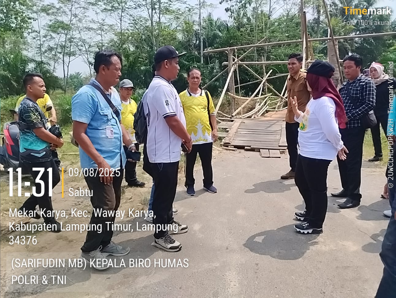 Usai menghadiri pembukaan Festival jalan sehat di Lapangan Merdeka Desa Sumberrejo, Kecamatan Waway karya pada Sabtu (9/7), Bupati Lampung Timur Hj. Ella Siti Nuryamah tinjau langsung lokasi jembatan penghubung antar Desa yang ambruk sejak awal tahun 2025 akibat dihantam banjir.