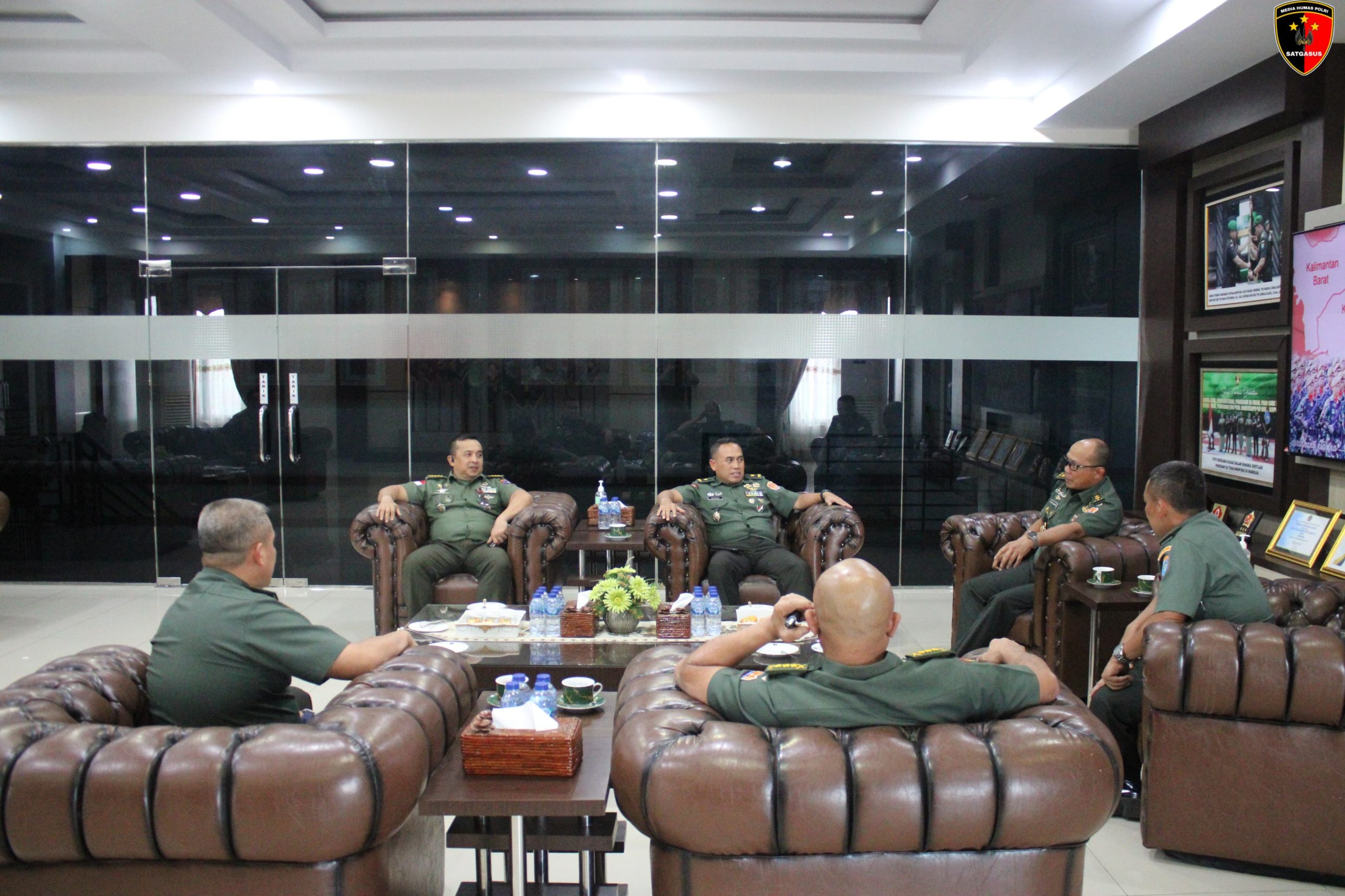 Pangdam XII/Tanjungpura diwakili Kapoksahli Pangdam XII/Tpr, Brigjen TNI Nursyamsudin terima kunjungan Tim Staf Ahli Kepala Staf Angkatan Darat (Kasad) Bidang Komunikasi Sosial (Komsos). Bertempat di Lobby Kehormatan, Makodam XII/Tpr, Senin (19/5/2025).