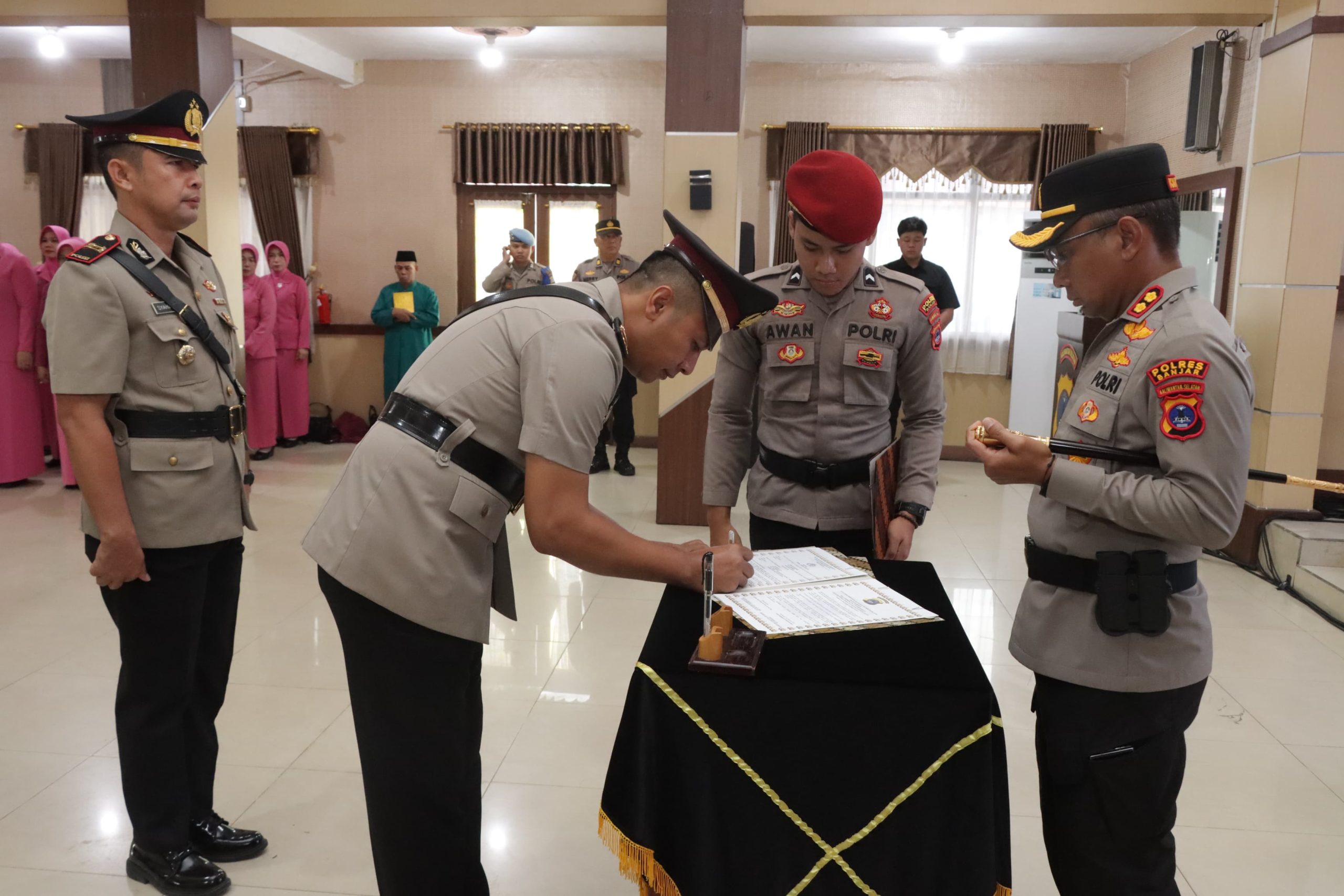 Kapolres Banjar AKBP M. Ifan Hariyat memimpin upacara Serah Terima Jabatan Kapolsek Martapura, Kapolsek Sungai Pinang, dan Kapolsek Pengaron, serta Kenaikan Pangkat Pengabdian PNPP Polres Banjar. Acara berlangsung di Aula Sarja Arya Racana Polres Banjar pada Jumat (28/2/2025) pagi.