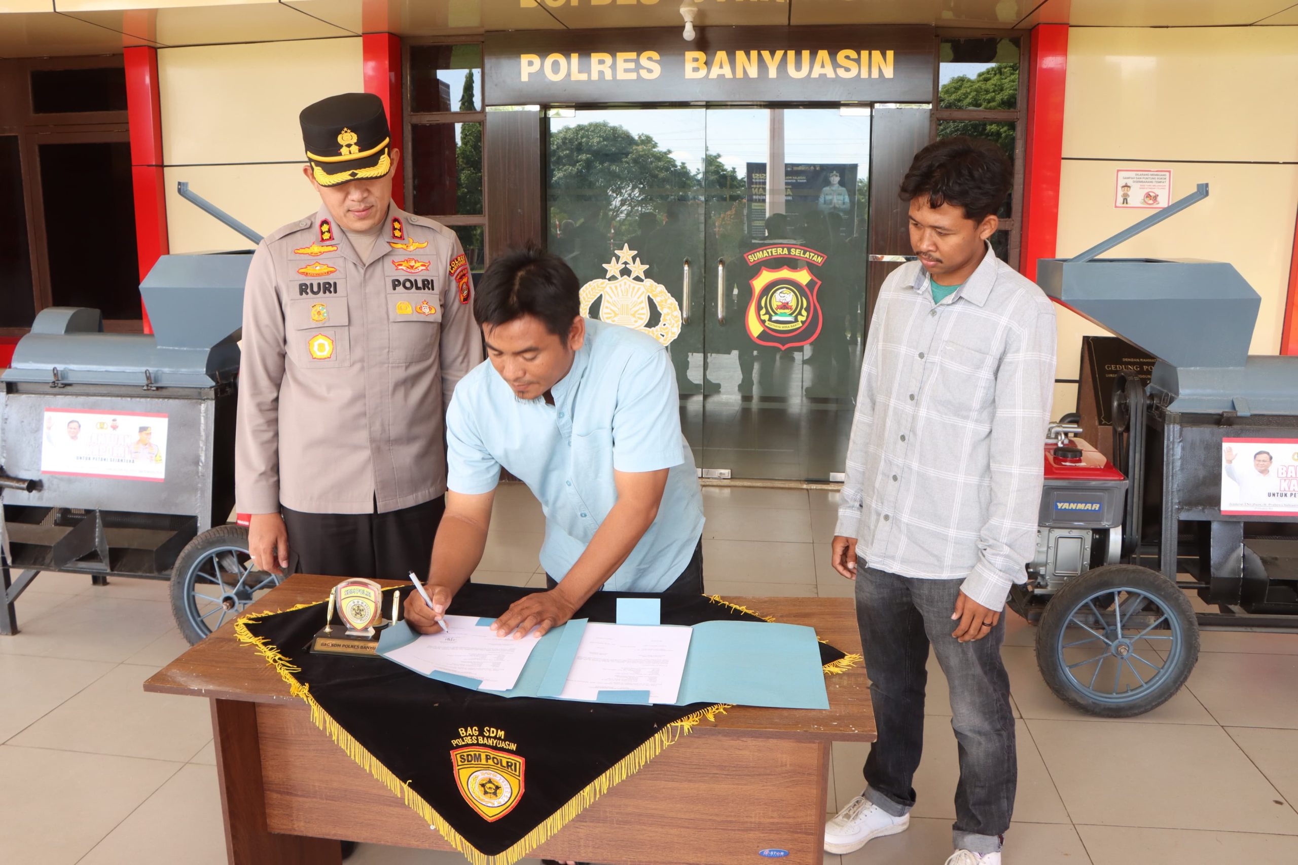 Guna mendukung Ketahanan Pangan dan meningkatkan Produktivitas petani, Polres Banyuasin menyerahkan bantuan mesin pemipil jagung dari Kapolri kepada dua kelompok tani di Kabupaten Banyuasin. Penyerahan bantuan ini berlangsung di Mapolres Banyuasin, pada Jumat (3/10/2025).