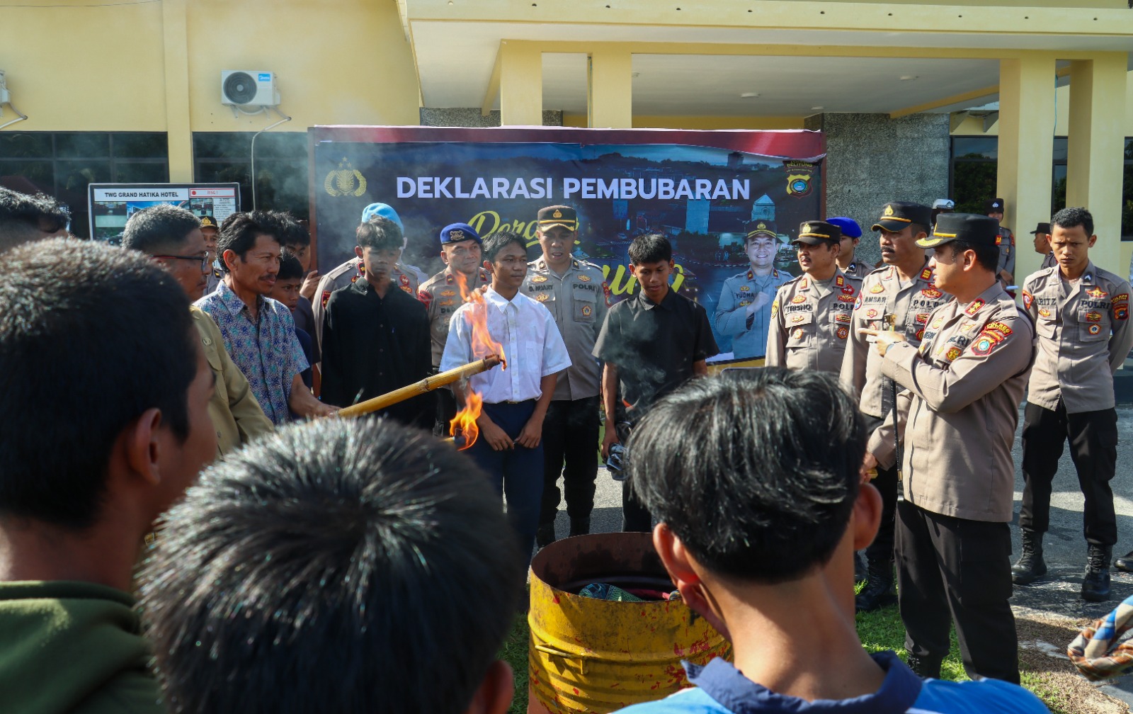 Setelah pembacaan deklarasi, acara dilanjutkan dengan penandatanganan deklarasi serta pemusnahan atribut perang sarung, termasuk bendera dan perlengkapan lainnya, sebagai simbol berakhirnya praktik yang dapat mengganggu ketertiban umum tersebut.
