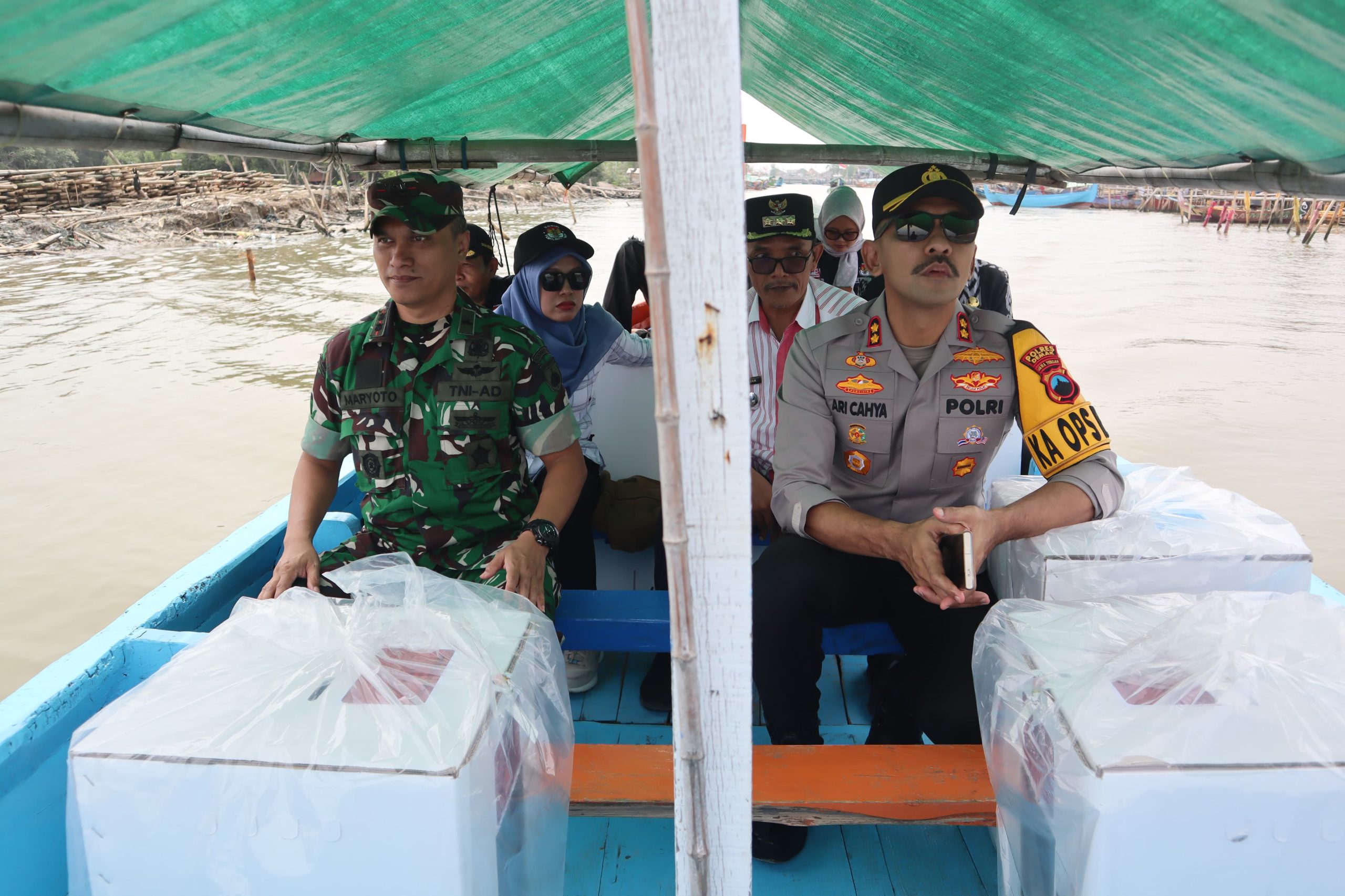 Kapolres Demak, AKBP Ari Cahya Nugraha, bersama Danramil 0716/Demak Letkol Kav Maryoto dan Ketua KPU Kabupaten Demak Siti Ulfaati mengawal logistik Pemilihan Kepala Daerah (Pilkada) 2024 ke daerah terpencil yang hanya bisa diakses dengan menggunakan perahu, Selasa (26/11/2024).