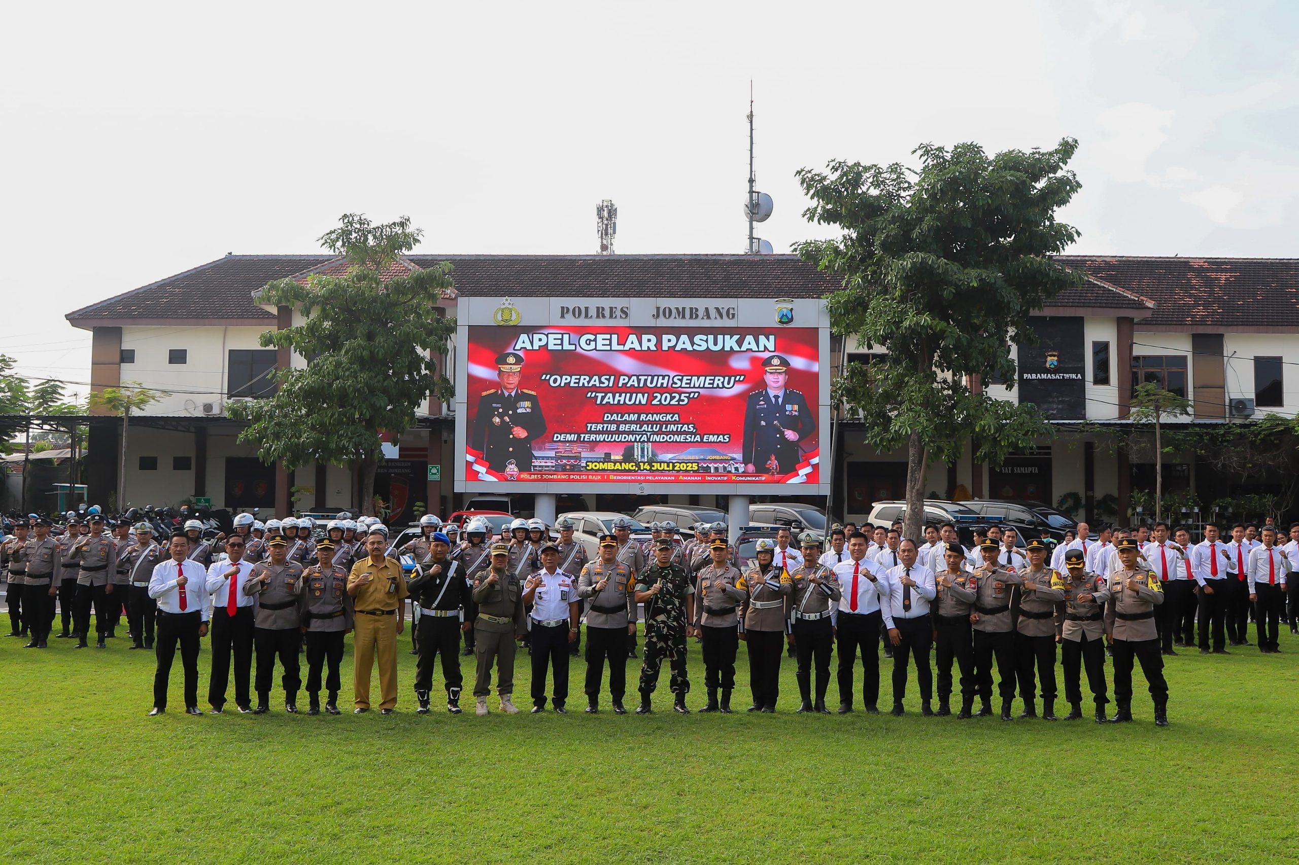 Dalam rangka meningkatkan kesadaran dan kepatuhan masyarakat terhadap peraturan lalu lintas, Polres Jombang melaksanakan Apel Gelar Pasukan Operasi Patuh Semeru 2025, bertempat di lapangan Cemerlang Mapolres setempat, pada Senin, (14/7/2025) pagi.