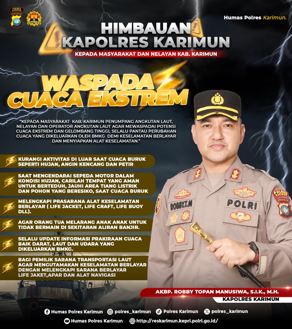 Dalam mengantisipasi kondisi cuaca ekstrem yang terjadi di wilayah hukum Kab. Karimun, Kapolres Karimun AKBP Robby Topan Manusiwa, S.I.K., M.H. kembali mengingatkan himbauan tentang menghadapi cuaca ekstrem agar selalu tetap waspada dan mengambil langkah-langkah pencegahan yang tepat di Kabupaten Karimun. Sabtu (11/01/2025).