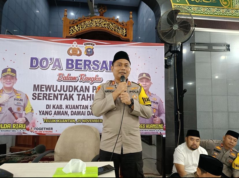 Dalam rangka mewujudkan Pilkada 2024 yang aman, damai, dan berkah, Kapolres Kuantan Singingi AKBP Pangucap Priyo Soegito, S.I.K., M.H., menggelar kegiatan Doa Bersama di Masjid Raya Teluk Kuantan pada Senin, 25 November 2024, dimulai pukul 04.30 WIB. Kegiatan ini bertujuan untuk mempererat sinergi antar lembaga dan masyarakat serta memohon doa agar seluruh tahapan Pilkada 2024 di Kabupaten Kuansing berjalan dengan lancar tanpa gangguan.