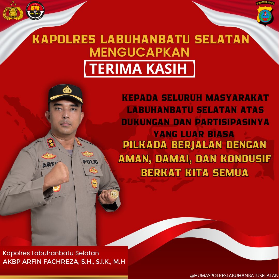 Kapolres Labuhanbatu Selatan, AKBP Arfin Fachreza, S.H., S.I.K., M.H., bersama Staff dan Jajaran menyampaikan ucapan terima kasih kepada seluruh masyarakat Kabupaten Labuhanbatu Selatan atas dukungan dan partisipasi aktif dalam pelaksanaan Pemilihan Kepala Daerah (Pilkada) serentak Tahun 2024.