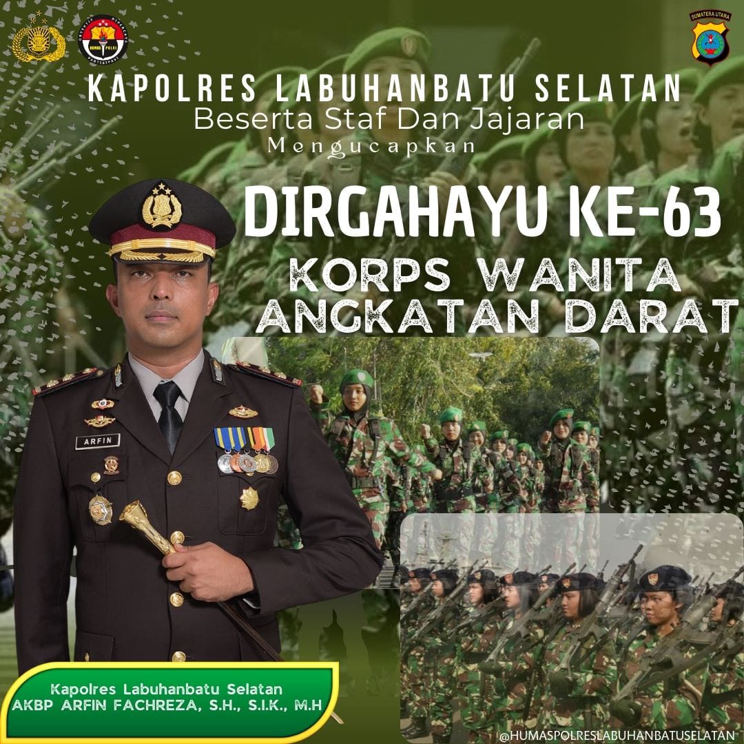 Dalam rangka peringatan Hari Ulang Tahun ke-63 Korps Wanita Angkatan Darat (Kowad), Kapolres Labuhanbatu Selatan, AKBP Arfin Fachreza Gelar, S.H., S.I.K., M.H., bersama staf dan jajarannya memberikan ucapan selamat sekaligus apresiasi atas peran strategis Kowad dalam mendukung tugas TNI dan pembangunan bangsa.