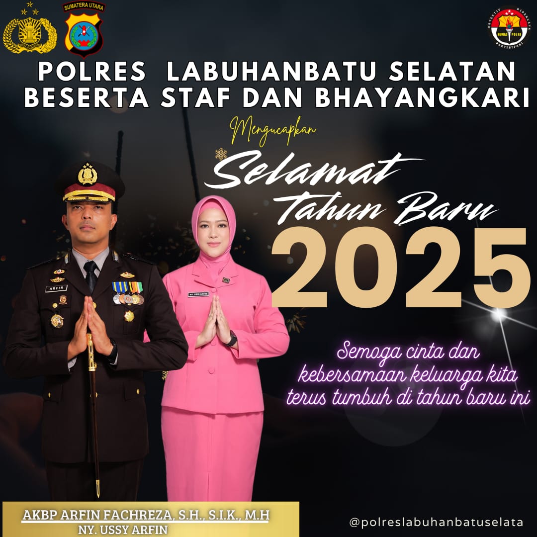 Kapolres Labuhanbatu Selatan, AKBP Arfin Fachreza, S.H., S.I.K., M.H., bersama Staff, Jajaran dan Bhayangkari menyampaikan ucapan selamat Tahun Baru 2025 kepada seluruh masyarakat, terutama di Kabupaten Labuhanbatu kegiatan.