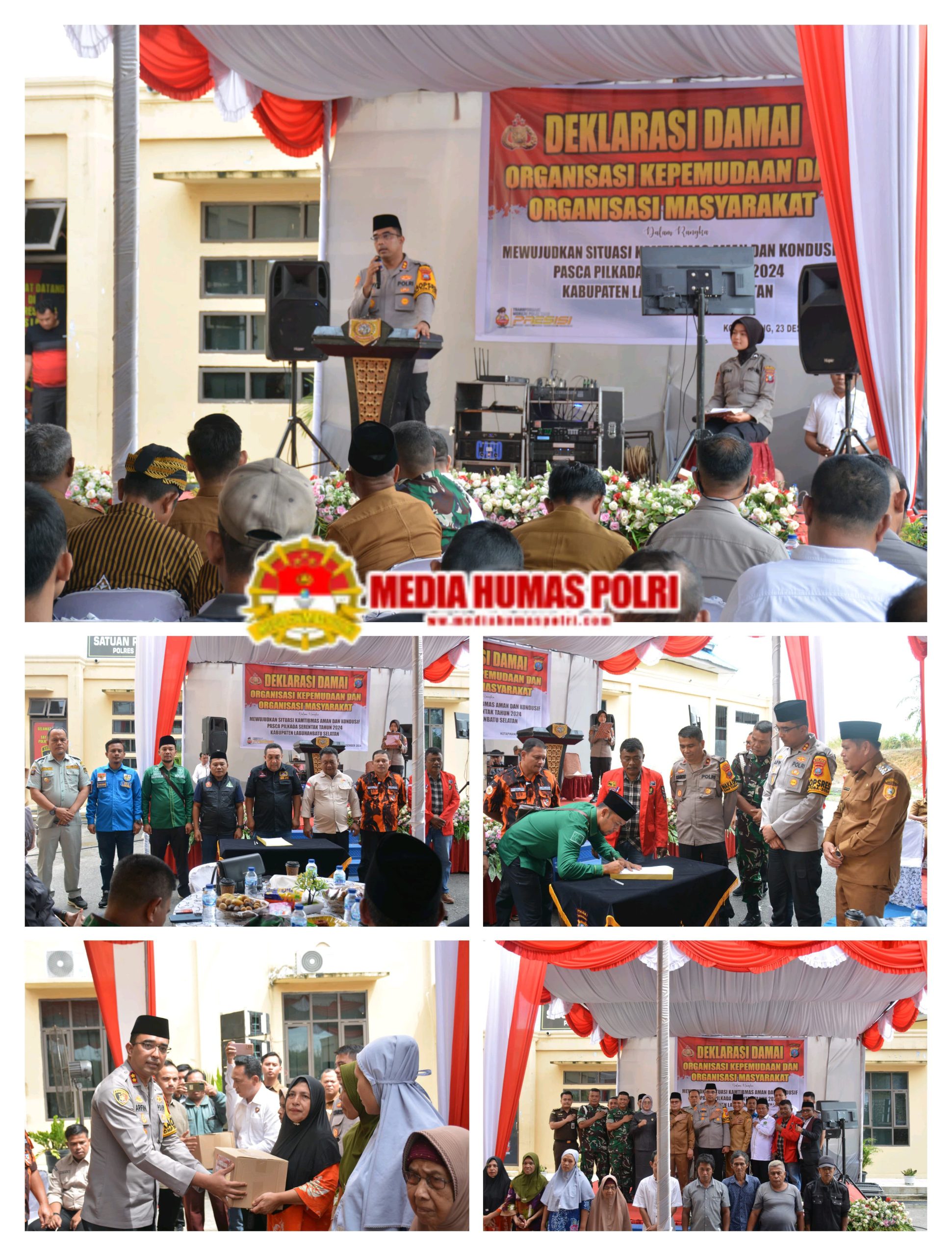 Dalam rangka menjaga keamanan dan ketertiban masyarakat (Kamtibmas) yang aman dan kondusif pasca Pemilihan Kepala Daerah (Pilkada) serentak 2024, Kapolres Labuhanbatu Selatan, AKBP Arfin Fachreza, S.H., S.I.K., M.H., menggelar kegiatan *”Deklarasi Damai”* bersama berbagai elemen masyarakat, Organisasi Kepemudaan dan Organisasi Masyarakat yang ada di Kabupaten Labuhanbatu Selatan yang diselenggarakan di halaman Apel Polres Labuhanbatu Selatan jalan lintas Sumatera Kotapinang-Gunung Tua, Desa Sosopan, Kecamatan Kotapinang, Kabupaten Labuhanbatu Selatan, Senin (23/12/2024).