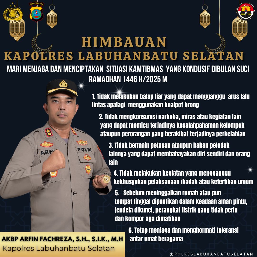 Dalam rangka menjalankan ibadah puasa di bulan suci Ramadhan 1446 H/2025 M, Kapolres Labuhanbatu Selatan, AKBP Arfin Fachreza, S.H., S.I.K., M.H., mengimbau masyarakat Kabupaten Labuhanbatu Selatan untuk menjaga keamanan dan ketertiban masyarakat (Kamtibmas) selama bulan suci Ramadhan 1446 H/2025 M.