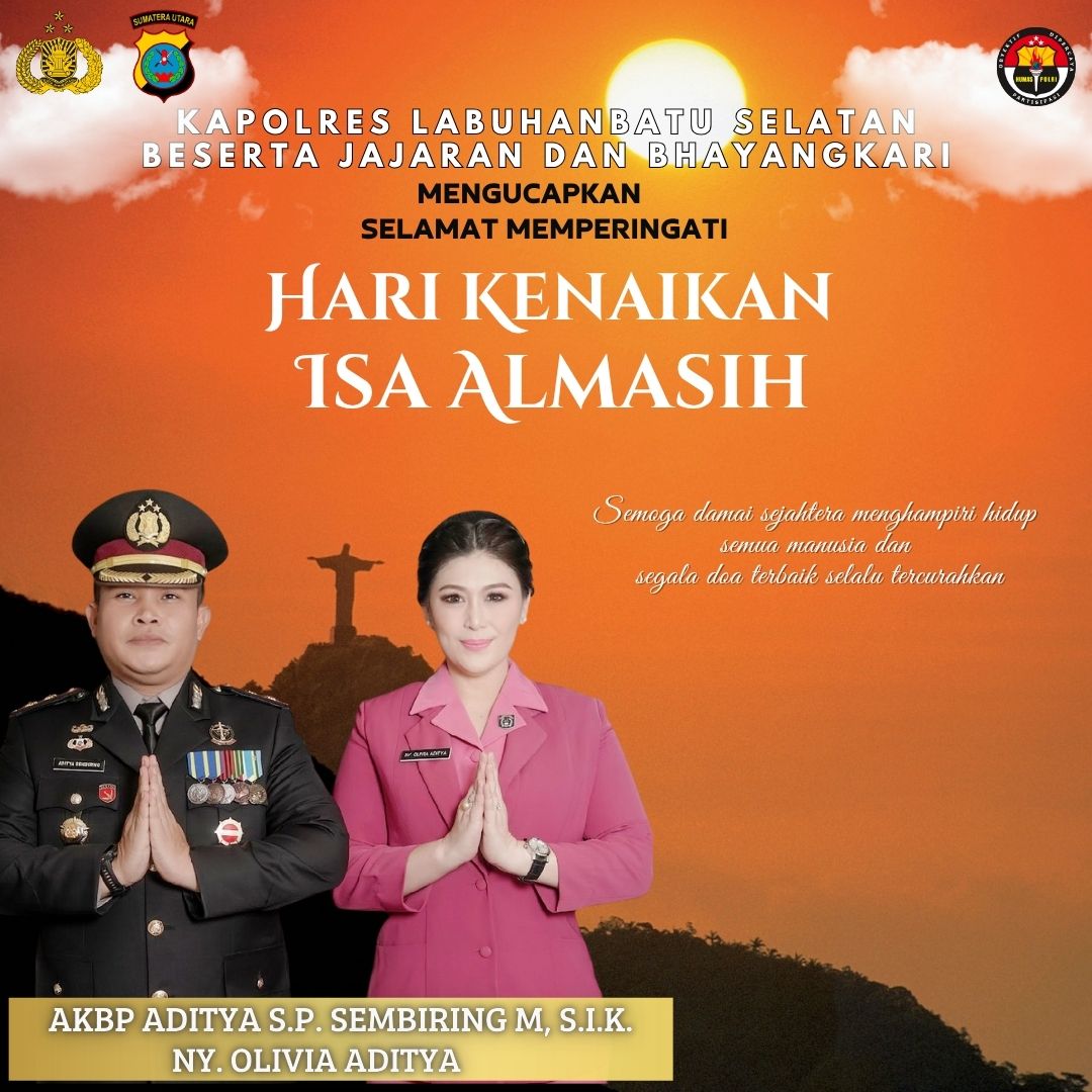 “Saya atas nama pribadi dan keluarga besar Polres Labuhanbatu Selatan mengucapkan Selamat memperingati Hari Kenaikan Isa Almasih bagi seluruh umat Kristiani. Semoga peringatan ini membawa kedamaian, kebahagiaan, dan semangat untuk terus berbuat kebaikan dalam kehidupan bermasyarakat,” ujar AKBP Aditya Sembiring.