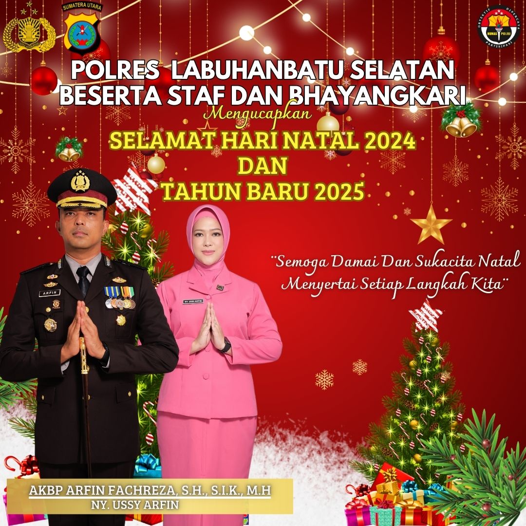 Dalam semangat menyambut Hari Natal 2024 dan Tahun Baru 2025, Kapolres Labuhanbatu Selatan, AKBP Arfin Fachreza, S.H., S.I.K., M.H., bersama jajaran staf dan Bhayangkari, menyampaikan ucapan selamat kepada seluruh masyarakat yang merayakannya.