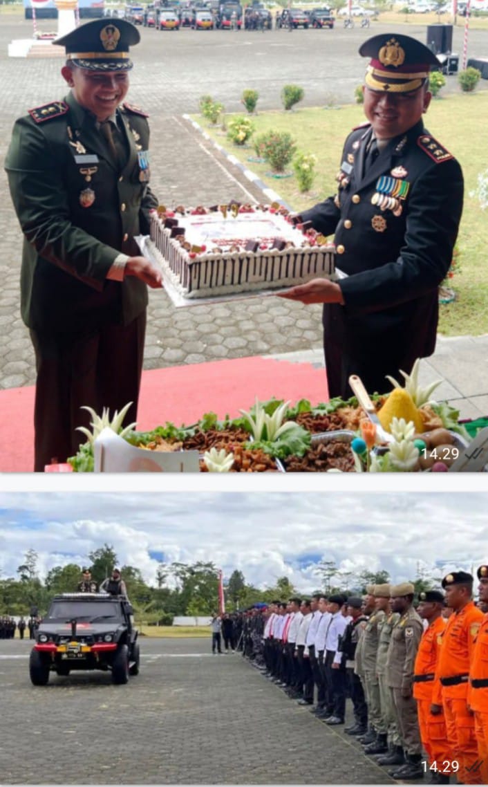 Keempat, tingkatkan sinergi dengan tni, pemerintah daerah, dan seluruh elemen masyarakat dalam menjaga kondusifitas wilayah. Selesai Upacara di Lanjutkan dengan Syukur HUT Bhayangkara ke 79 yg di laksanakan di tempat yang sama. Dalam Syukur tersebut Dandim 1710 Mimika Letkol Inf Mochammad Slamet Wijaya Menyerahkan Kue Ulang Tahun kepada Kapolres Mimika. Kegiatan tersebut berjalan Aman dan Lancar. ( Ferry Nelson Saily )