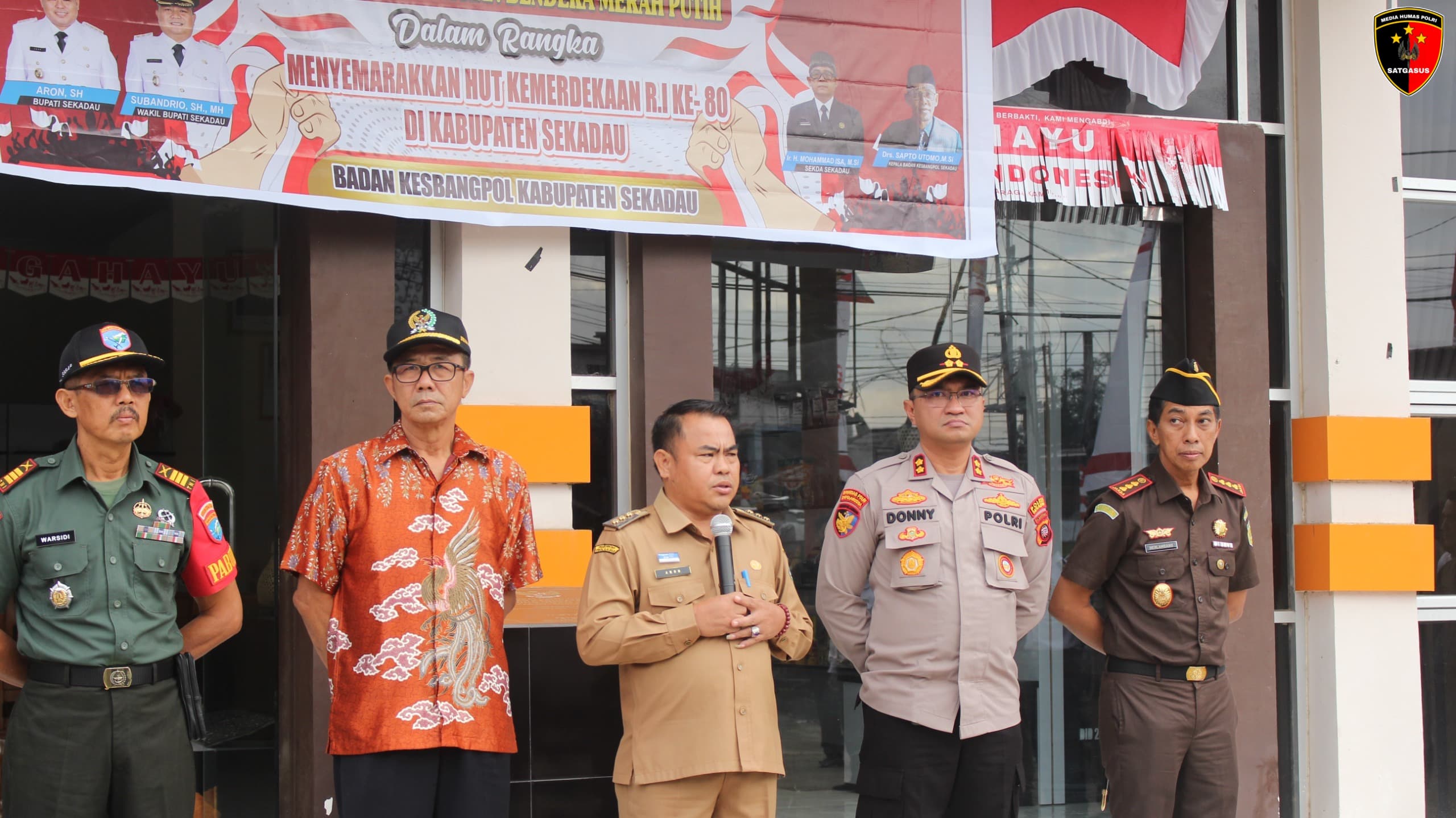 Kapolres Sekadau AKBP Donny Malino Manoppo hadir dalam Gerakan Pembagian Bendera Merah Putih yang digelar di Gedung UMKM, Desa Sungai Ringin, Kecamatan Sekadau Hilir, Senin (11/8/2025).