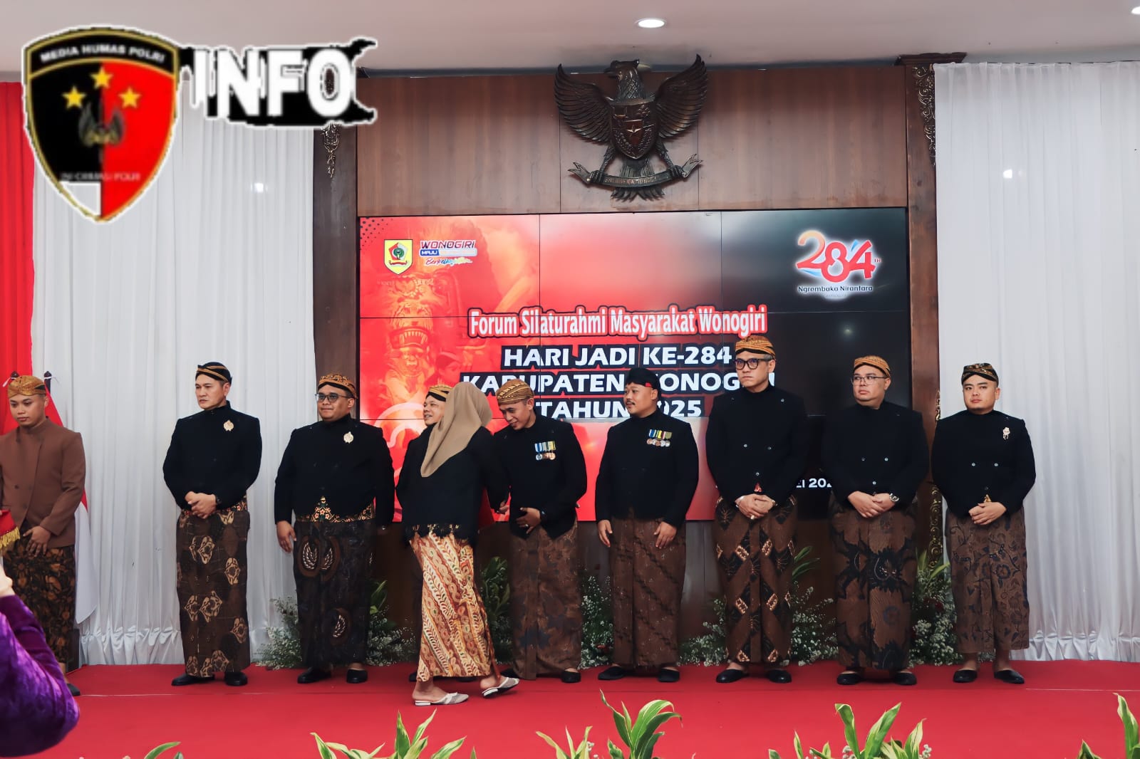 Dalam rangka memperingati Hari Jadi ke-284 Kabupaten Wonogiri, Kapolres Wonogiri turut hadir dalam acara Silaturahmi Masyarakat yang digelar sebagai bentuk pelestarian nilai-nilai perjuangan Raden Mas Said, Senin (19/5/2025). Kegiatan yang berlangsung khidmat tersebut dihadiri pula oleh Bupati Wonogiri, Ketua DPRD, jajaran Forkopimda, tokoh masyarakat, serta berbagai unsur organisasi dan elemen masyarakat Wonogiri.