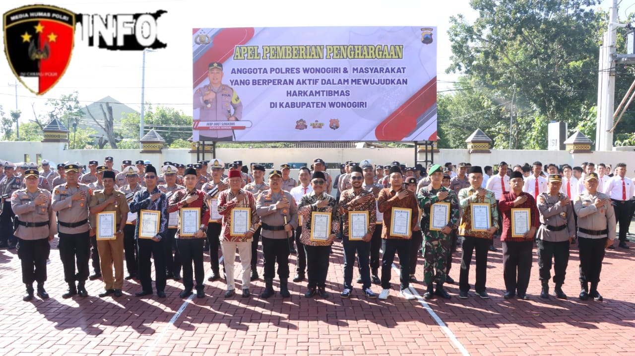 Penghargaan diberikan kepada 9 warga masyarakat dan 8 personil Polres Wonogiri serta 1 personil Kodim 0728/Wonogiri yang telah berperan aktif dalam mewujudkan situasi Kamtibmas yang aman dalam pengamanan Mudik Balik Lebaran 2025 di Kabupaten Wonogiri.