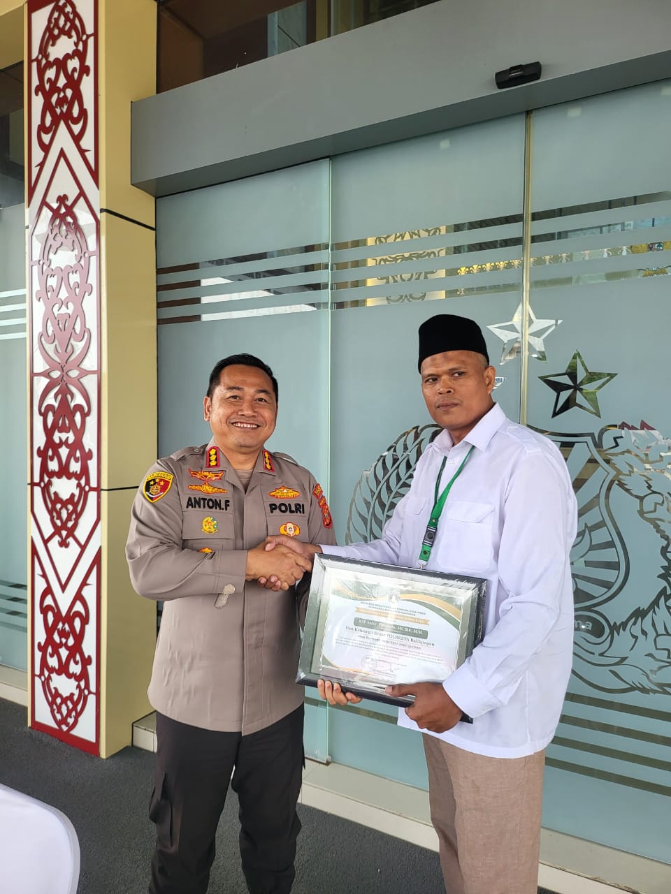 Perwakilan Ponpes Hidayatullah dari Bidang Humas, Bapak Ali Suwantono, menyampaikan apresiasi atas kepedulian Polresta Balikpapan terhadap lembaga pendidikan keagamaan dan masyarakat sekitar. Sebagai bentuk penghargaan, pihak pondok pesantren menyerahkan plakat kepada Kapolresta Balikpapan.