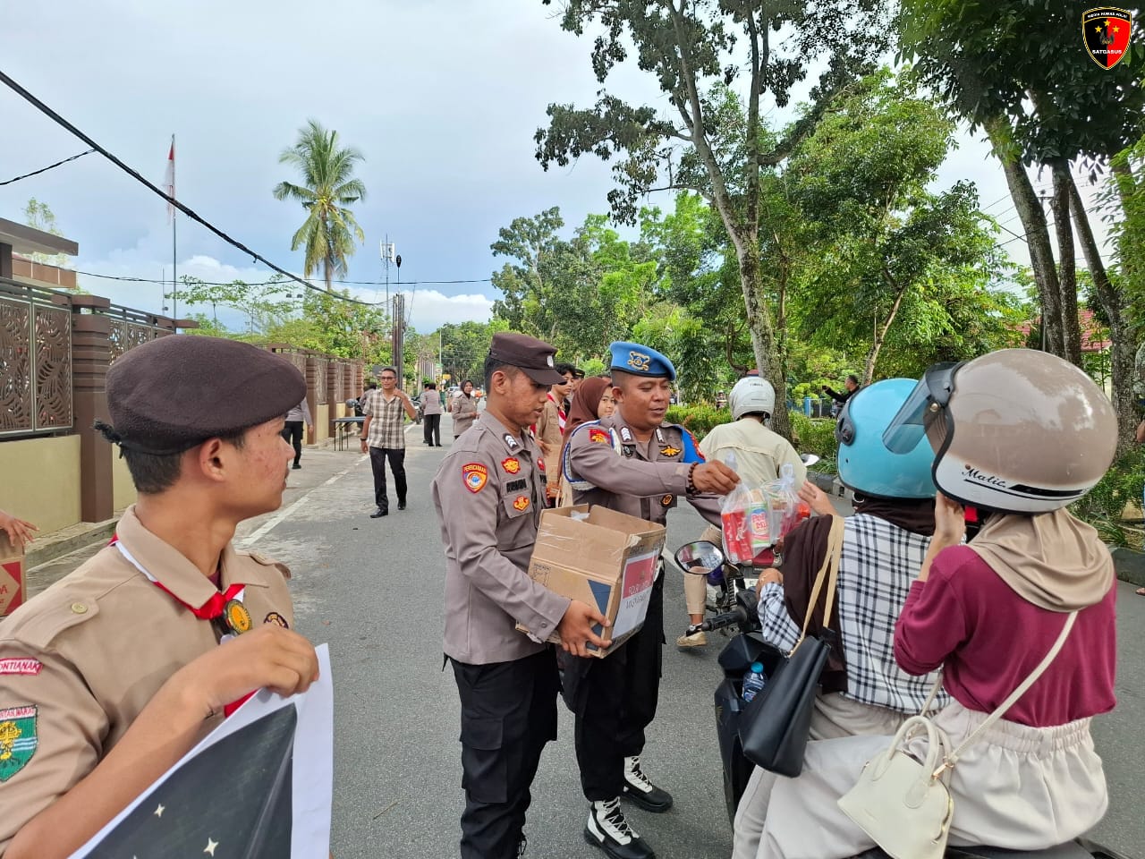 Para anggota Saka Bhayangkara dengan semangat membagikan ratusan paket takjil kepada para pengendara yang melintas. Mereka juga mengimbau masyarakat untuk tetap tertib berlalu lintas dan menjaga keselamatan selama berkendara.