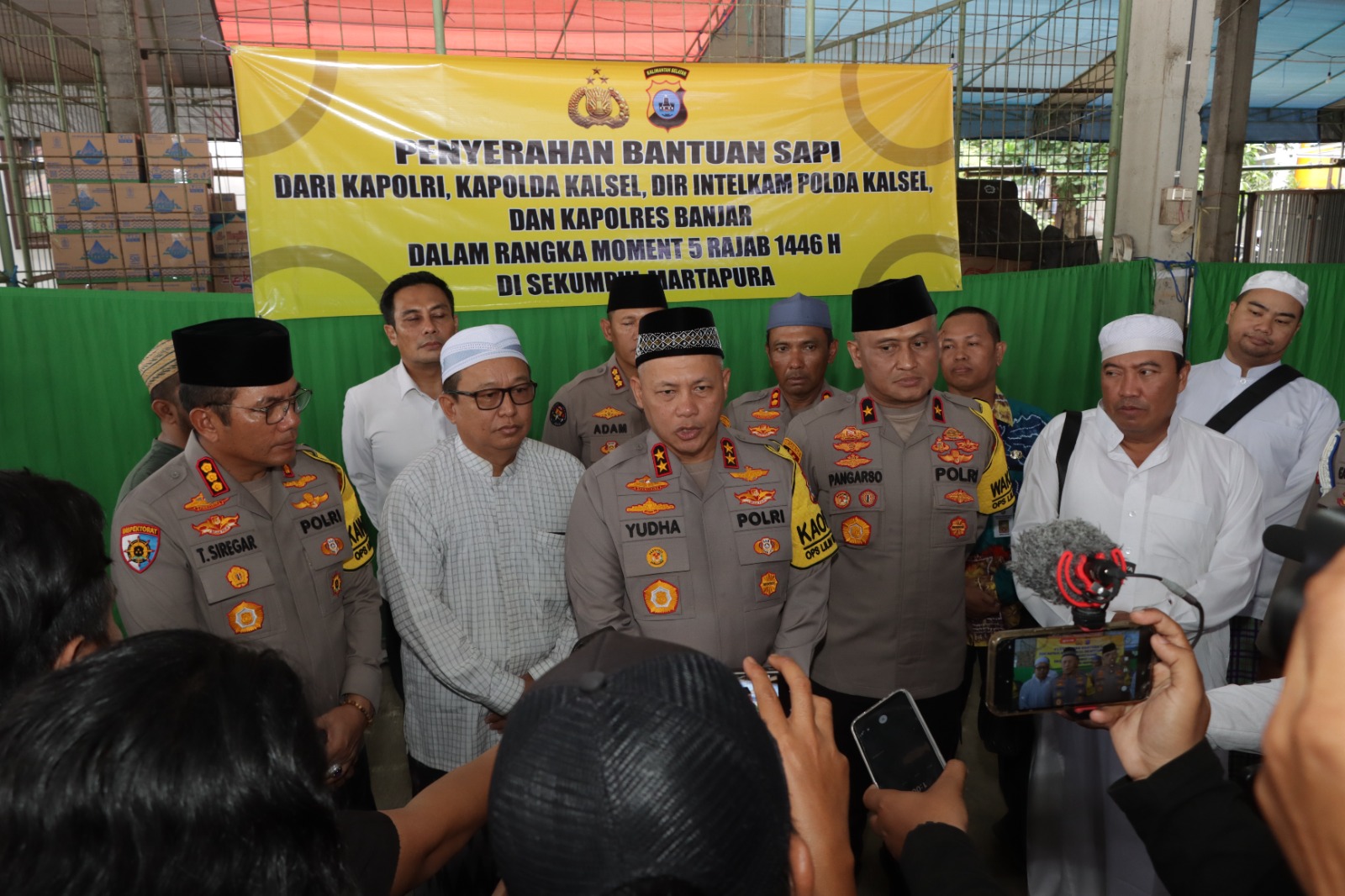 Kapolda Kalimantan Selatan, Irjen Pol Rosyanto Yudha Hermawan, S.H., S.I.K., M.H., menyerahkan empat ekor sapi jenis Limousin dari Kapolri Jenderal Drs. Listyo Sigit Prabowo, M.Si kepada panitia peringatan momen 5 Rajab 1446 H / 2025 M. Penyerahan dilaksanakan di Dapur Umum Sektor Taufik, Jl. Pendidikan Gang Taufik, Kelurahan Sekumpul, Kecamatan Martapura, Kabupaten Banjar Kalimantan Selatan, pada Kamis (02/01/2025) pagi.