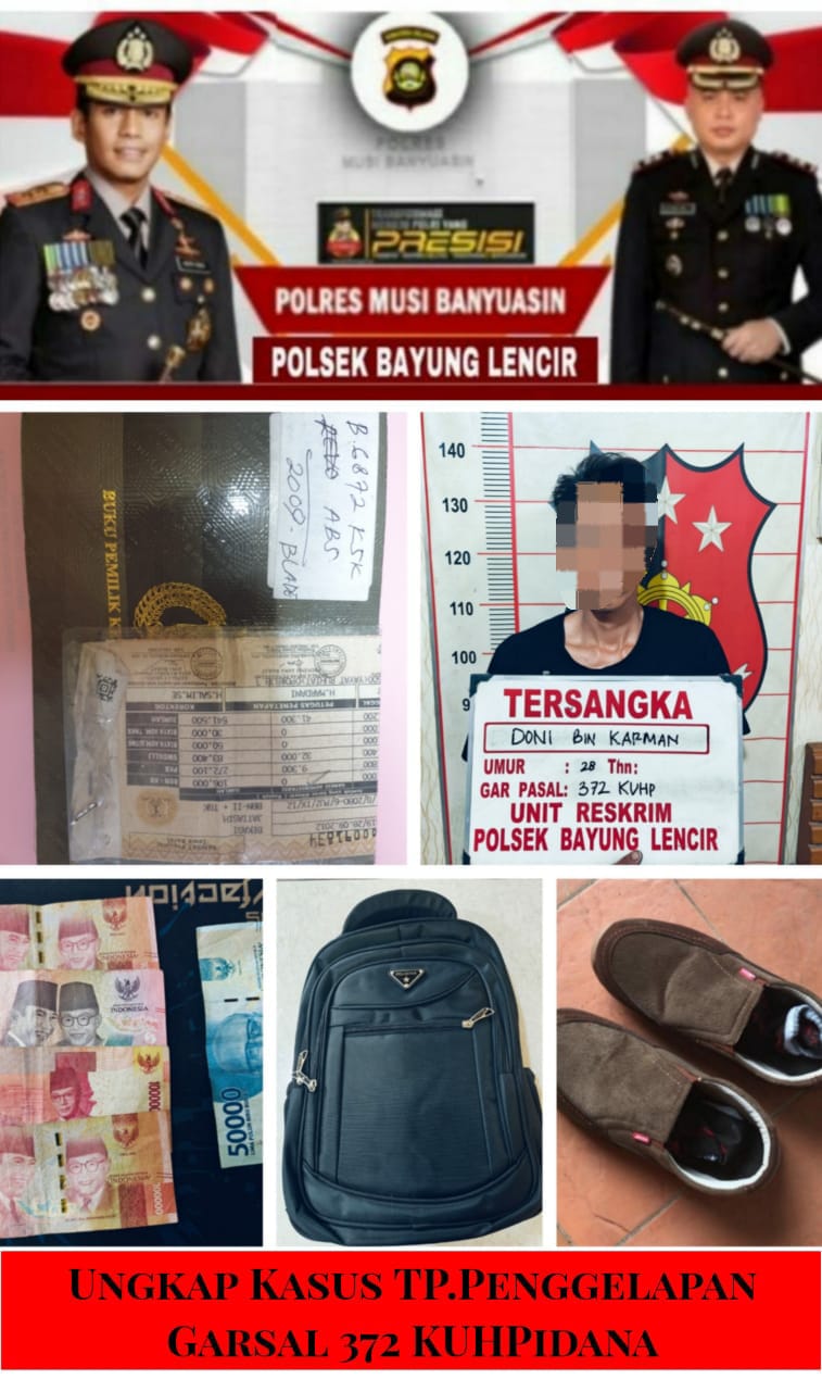 Polsek Bayung Lincir Polres Muba menangkap Seorang Pria bernama Doni (28) Warga Dusun IV Desa Muara Punjung Kec. Babat Toman yang menggelapkan sepeda motor milik Bos nya tempat ia bekerja. Awalnya pelaku Doni berpura – pura minjam sepeda motor dinas kelontongan korban.