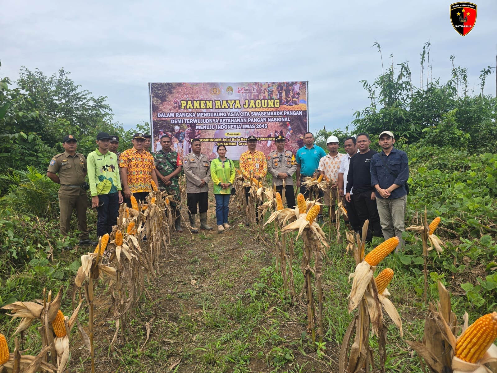 Kapolsek Jelai Hulu Ipda Zaenal Mutakhir, S.H. bersama Camat Jelai Hulu Seth Ariel, S.Th., Kepala Desa Periangan Paskalis Didi, serta Manager Gaharu Estate PT Bangun Nusa Mandiri (BNM) Ginting, melaksanakan kegiatan pemanenan jagung hibrida di areal perkebunan PT BNM, Desa Periangan, Kecamatan Jelai Hulu, pada Kamis, 13 November 2025.