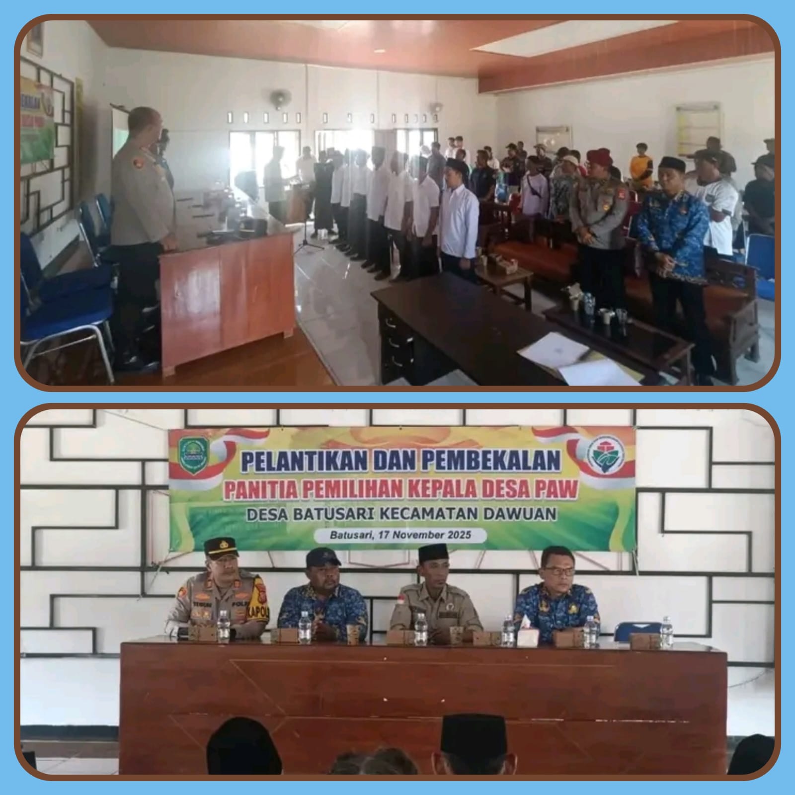 Polisi Sektor Kalijati Hadiri pelaksanaan Pelantikan dan Pembekalan Panitia Pemilihan Kepala Desa PAW Desa Batusari Kecamatan Dawuan Kabupaten Subang, Yang bertempat di Aula Desa Batusari. Senin (17/11/2025) Pukul 08.30.WIB
