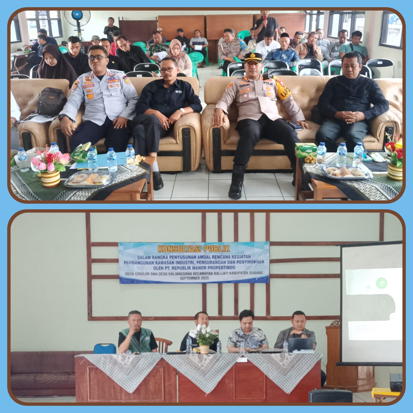 Dalam rangka penyusunan AMDAL rencana kegiatan pembangunan Kawasan Industri, Pergudangan dan Penyimpanan oleh PT.Republik Manor Propertindo di Desa Ciruluk dan Desa Kaliangsana, Pertemuan bertempat di Aula Kantor Kecamatan Kalijati Kamis ( 18/09/2025 ) Pukul 09.00 WIB. Sampai Selesai..