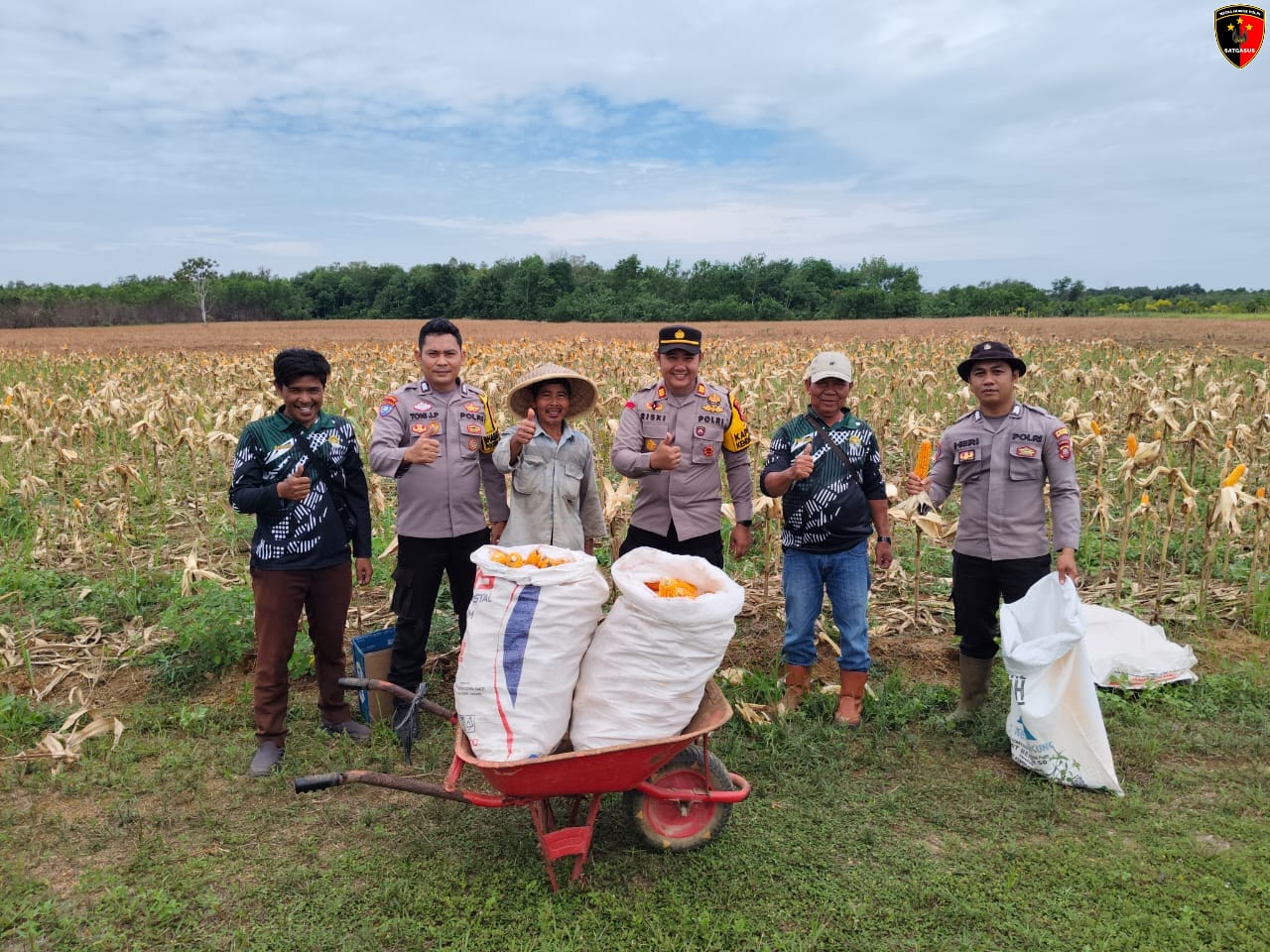 Kapolsek Kendawangan Polres Ketapang, AKP Riski Arifianto, bersama anggotanya turut serta dalam kegiatan panen jagung hibrida di lahan milik Kelompok Tani Tunggul Ulin Betunas, Desa Mekar Utama, Kecamatan Kendawangan, Rabu (25/6).