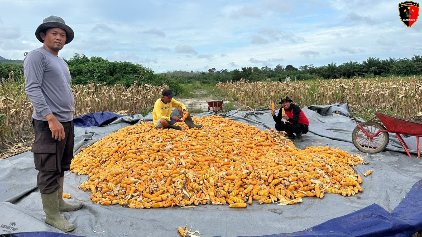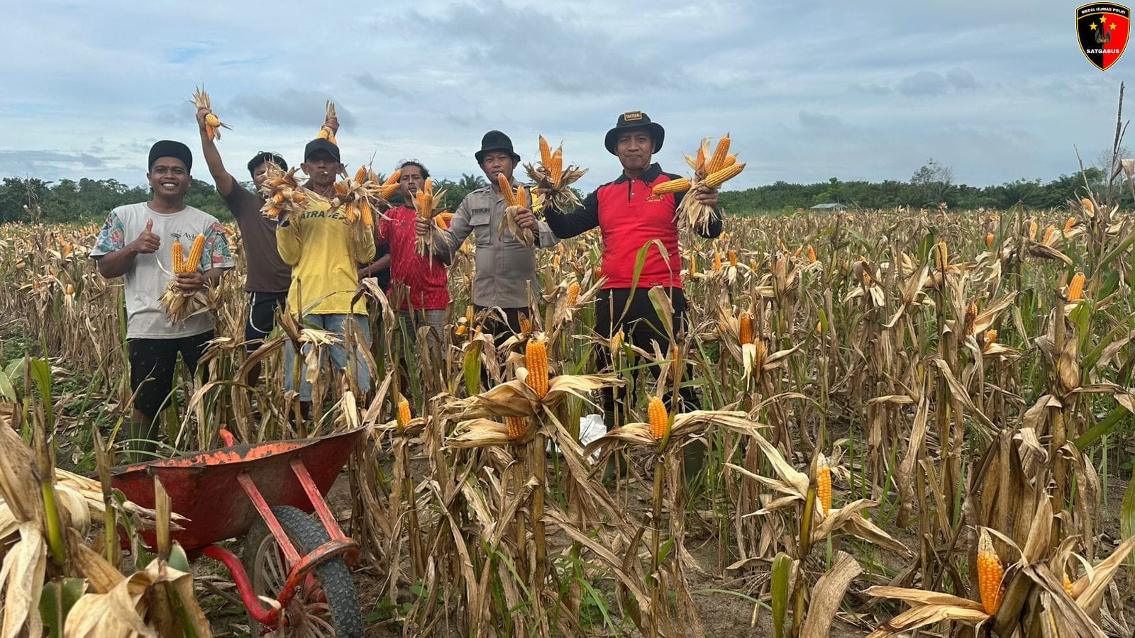 Kapolsek Nanga Tayap, IPTU Bagus Tri Baskoro, S.H., M.Si., bersama Bhabinkamtibmas Aipda Teguh, melaksanakan kegiatan panen jagung hibrida di lahan milik Kelompok Tani (Poktan) Sinar Harapan yang terletak di Desa Lembah Hijau 2, Kecamatan Nanga Tayap, pada Rabu (19/6).